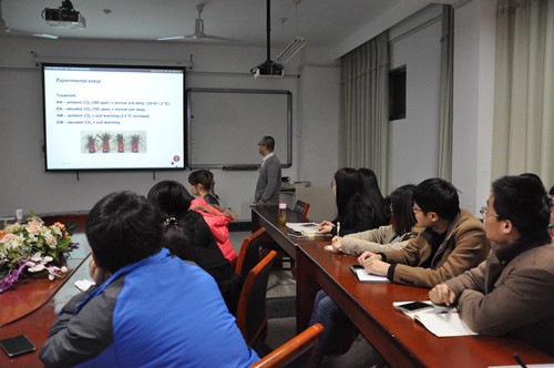 报告开始,主持人王笑老师对Fulai Liu副教授的到来表达了热烈的欢迎,紧接着对他的工作和科研做了简单的介绍。Fulai Liu 副教授于2000年获德国汉诺威大学园艺科学系农学硕士,2004年获得丹麦皇家兽医农业大学农学博士。1996-1998年在中国农业科学院土壤与肥料研究所担任助理研究员,2000-2001年在德国汉诺威大学园艺科学系担任研究助理。2004年起在丹麦哥本哈根大学任助理教授、副教授。Fulai Liu 主要在作物逆境生理及特别在干旱胁迫诱导的根源化学信号对作物营养与生殖发育的调控、作物响应气候变化等领域开展研究、碳水化合物代谢及水分利用效率的影响等方面进行了系统的研究。Fulai Liu 作为主要研究人员主持或参加欧盟合作项目、丹麦科学研究基金会项目十余项,是丹麦哥本哈根大学博士学位委员会主席、吉林大学兼职教授、番号鸽 客座教授、中科院东北农林研究院兼职研究员。Fulai Liu博士还是中丹联合大学(丹麦政府与中国科学院合作办学,以联合培养两国研究生为主)的协调人和主要负责人。