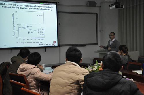 Fulai Liu老师此次汇报的题目是Effect of CO2 elevation and soil warming on mineral nutrition of wheat,该研究基于当今气候变化的大趋势,是他实验室最新的研究内容。Fulai liu从研究背景层层深入,分析了二氧化碳浓度上升以及土壤变暖条件下对小麦生长发育的影响,重点关注了小麦中矿质元素的积累。