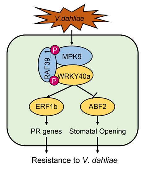 近日,棉花遗传与种质创新利用团队在国际著名学术期刊Advanced Science在线发表了题为“GhMPK9-GhRAF39_1-GhWRKY40a Regulates the GhERF1b- and GhABF2-mediated Pathways to Increase Cotton Disease Resistance”的研究论文。该研究揭示了棉花GhMPK9-GhRAF39_1-GhWRKY40a磷酸化途径激活乙烯响应因子GhERF1b的转录并促进PR基因表达,同时抑制ABA响应基因GhABF2 的表达调控气孔开放,进而促进棉花对黄萎病抗性的分子机制。
