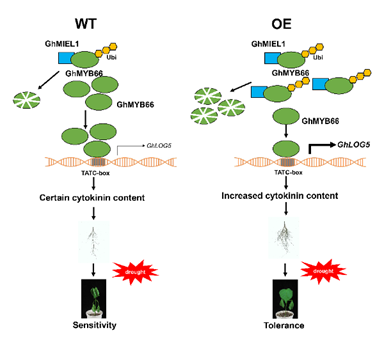 GhMIEL1-GhMYB66-GhLOG5分子模块调控棉花耐旱性的工作模式图
