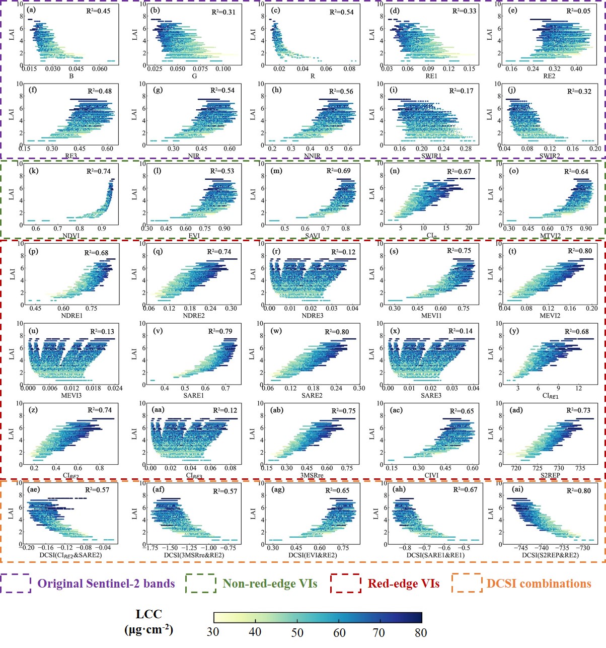 该研究首先阐明LCC变化的光谱效应是导致红边VI-LAI模型推广过程中普适性差的主要原因之一。随后,提出光谱指数差值组合算法(Difference combination of spectral index, DCSI)来组合红边植被指数,同时缓解LCC变化的光谱效应,并且优选最佳的植被指数组合用于不同LCC条件下小麦LAI的估算。最后,衍生出一个适用于大尺度LAI估算的新红边植被指数,命名为基于Sentinel-2的改良红边位置(Sentinel-2 modified red-edge position, S2MREP)。