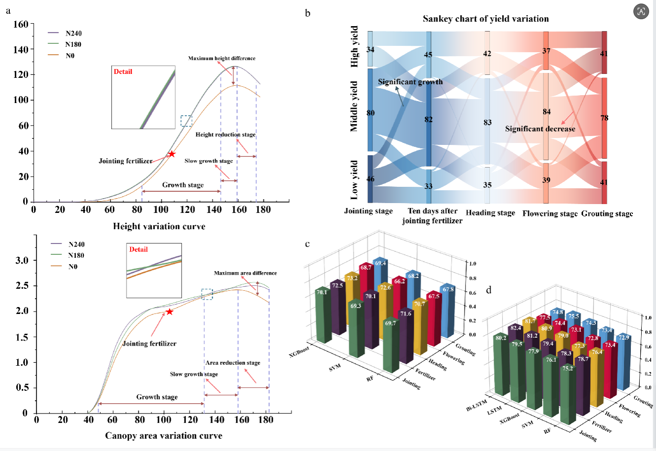 本研究进一步分析了表型的动态变化特征,提出了性状快速变化期、缓慢变化期、降低期、最大高度/面积差及高度面积变化率五类动态时序表型。采用机器学习技术分别使用静态和动态参数预测叶面积指数和产量。在静态参数预测中,使用每个采集节点的小区高度、冠层面积和体积进行预测;在动态参数预测中,计算每个小区在采集时间间隔内的高度、面积和体积变化率,并用这些变化率预测叶面积指数和产量。共获得20160组数据(21次采集,每次960个小区),并按照70%训练集、15%测试集和15%验证集进行划分。使用XGBoost、SVM和随机森林模型进行静态表型的训练。对于动态参数预测,采用LSTM和Bi-LSTM基于时间序列的模型,时间步长作为特征向量纳入训练。结果表明,动态表型预测精度高于静态表型,尤其在施用拔节肥后和抽穗期等关键生育阶段,基于时间变化率的预测精度尤为突出,展示了动态表型在捕捉作物表型变化与长势关系中的优势。