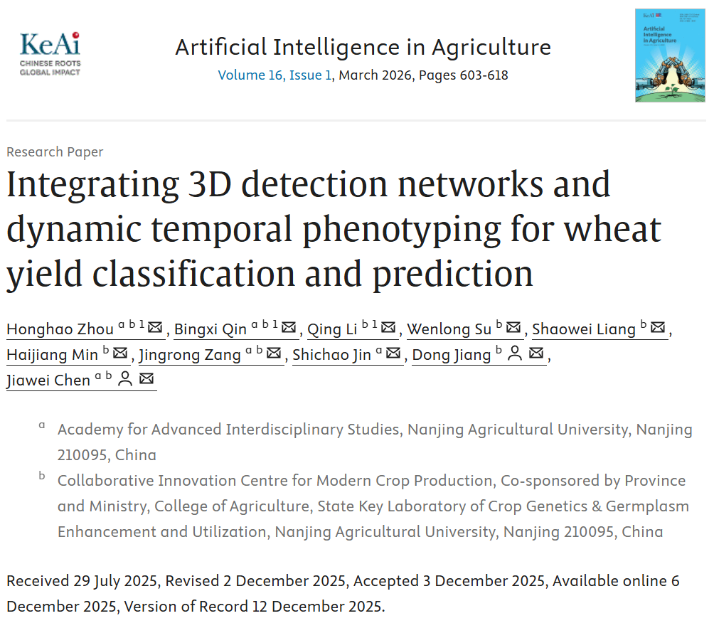 《Artificial Intelligence in Agriculture》发表姜东教授团队“Integrating 3D detection networks and dynamic temporal phenotyping for wheat yield classification and prediction
