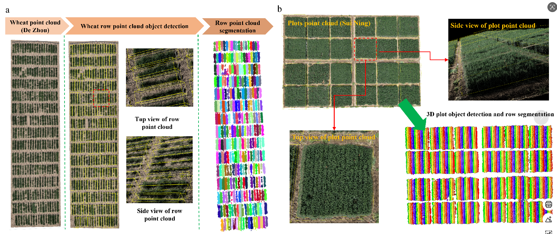 研究目标:为解决上述问题,本研究团队基于三维目标检测网络与动态时空表型构建了小麦全生育期长势和产量预测与分级的新框架,系统性地提升了小麦全生育期三维表型自动化分析与长势和产量预测的精度与效率。该框架包含五个主要创新点:(1) 提出三维基准面辅助的小区分割算法,实现高效点云提取与检测框快速标注,提升前期预处理效率。(2) 构建了融合三维跨层特征金字塔网络(CFPT 3D)与空间注意力模块(AATT)的3D Wheat Plot Detection Net,显著增强模型在深度特征识别和候选框关键特征提取方面的能力,兼具更优的精度与训练效率。(3) 创新利用点云密度空间分布实现行级点云分割,为独立计算行级表型参数提供基础。(4)开发3D Wheat Plot Phenotype Extraction软件,集成三维可视化与静态、动态表型自动提取,实现从点云处理到表型输出的全流程自动化。(5) 构建动态表型预测体系,根据小麦不同生育时期的静态表型提出性状快速变化期、缓慢变化期、降低期、最大高度/面积差及高度面积变化率五类动态时序表型,结合机器学习实现长势和产量的预测与分级。