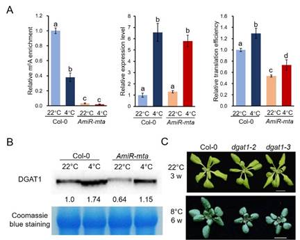 另外,该研究通过关联分析发现冷响应基因DGAT1(Diacylglycerol Acyltransferase 1)在AmiR-mta突变体中的m6A修饰水平和蛋白翻译效率降低,但其转录表达水平没有发生显著变化(图2A和B)。缺失DGAT1不影响拟南芥在常温下的生长,但会导致其耐冷性降低(图2C)。