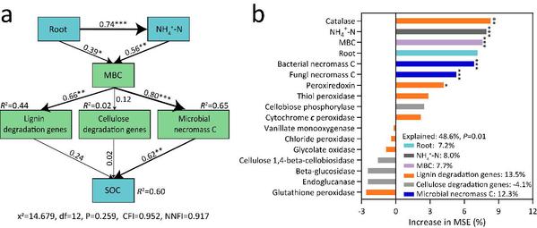 图1-6. 结构方程模型和随机森林模型揭示了根茬生物量和土壤NH4+-N含量对SOC的影响