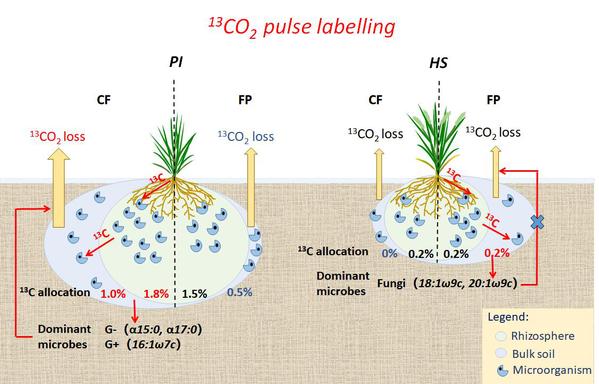 图2-1. 长期肥料后移通过改变活性微生物群落结构,减少光合碳损失并增加土壤中微生物碳源的输入
