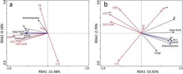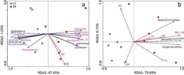 图1-5.RDA显示了参与木质素和纤维素降解的不同微生物(a)和微生物残体与土壤化学性质间的关系(b)