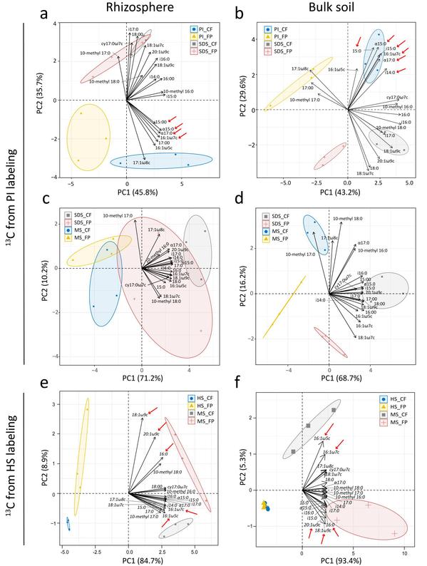 图2-5. 根际和非根际土壤中的13C-PLFA组成的主成分分析. a-d: 幼穗分化期13CO2标记6小时后至收获时的微生物组成的变化; e-f: 抽穗期13CO2标记6小时后至收获时的微生物组成的变化