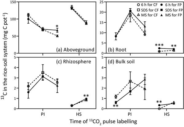 论文Long-term fertilizer postponing increases soil carbon sequestration by changing microbial composition in paddy soils: A 13CO2labelling and PLFA study,该研究通过对幼穗分化期(panicle initiation stage,PI)和抽穗期(heading stage,HS)的植株进行13CO2脉冲标记,探究在长期肥料后移下,水稻活根释放的碳对土壤有机质的影响。结果表明肥料后移不影响植物在幼穗分化期和抽穗期同化光合碳的能力,但显著降低了幼穗分化期同化光合碳的损失(图2-2, 2-3)。13C损失量与微生物生物量[13C磷脂衍生脂肪酸(PLFA)含量]和微生物群落组成显著正相关。在幼穗分化期13CO2标记6小时后,肥料后移显著降低了总13C-PLFA含量(图2-4),这主要是因为肥料后移减少了利用该时期同化13C的优势微生物[即G−(α15:0和α17:0)和G+(16:1ω7c)细菌](图2-5)。而在抽穗期13CO2标记6小时至收获时,肥料后移显著增加了13C-PLFA含量(图2-4),主要是因为肥料后移增加了利用该时期同化13C的优势微生物(即真菌18:1ω9c和20:1ω9c)(图2-5)。并且冗余分析表明,在幼穗分化期和抽穗期使用13C的微生物分别受到土壤可溶性有机氮和总氮的调节(图2-6)。因此,长期肥料后移通过减少幼穗分化期土壤中G−和G+细菌的含量降低了同化光合碳的损失,并通过增加抽穗期土壤中真菌的含量提高了土壤中微生物碳源的输入(图2-1)。