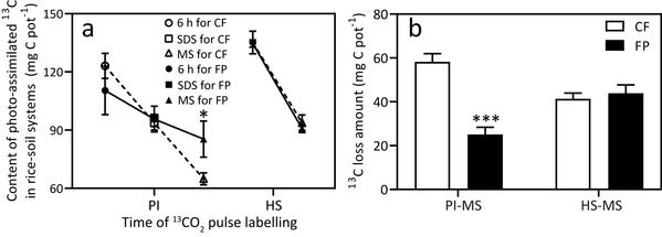 图2-2. 肥料后移对水稻-土壤系统中总13C积累量(a)和标记-收获阶段13C损失量(b)的影响