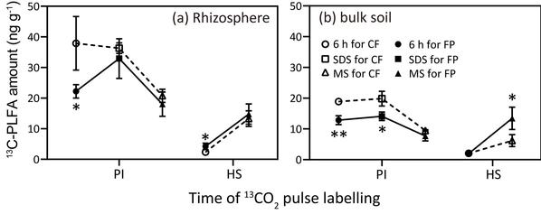 图2-4. 肥料后移对根际土(a)和非根际土(b)中13C-PLFA含量的影响