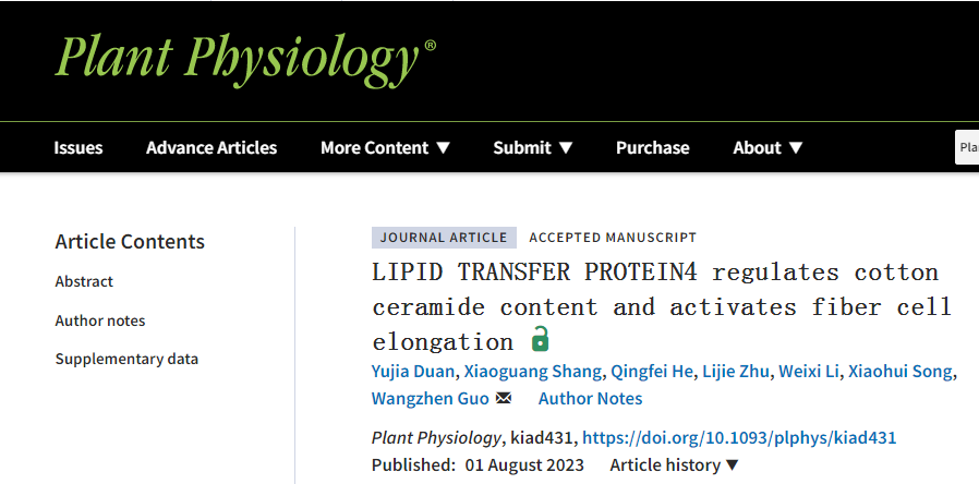 《Plant Physiology》发表郭旺珍教授团队“LIPID TRANSFER PROTEIN4 regulates cotton ceramide content and activates fiber cell elongation”