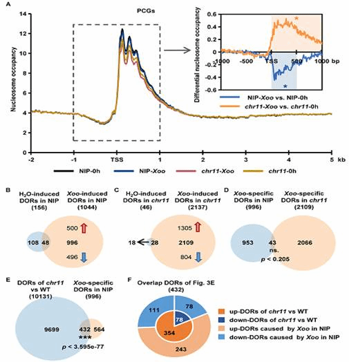 OsCHR11属于ISWI类染色质重塑蛋白,该类蛋白可利用水解ATP释放的能量调控染色质中DNA与核小体间的互作来重塑染色质,进而调控基因的表达。该研究利用CRISPR-Cas9基因编辑系统产生了OsCHR11的突变体。微球菌核酸酶全基因组MNase-seq分析发现,OsCHR11的突变及水稻白叶枯菌Xoo侵染均影响全基因组的核小体排布。OsCHR11的突变会造成全基因组14%位点的核小体占有率变化,证明OsCHR11是维持水稻全基因组核小体稳定的必需基因。同时,Xoo侵染显著减少全基因组水平的核小体占有率,暗示Xoo可能通过操纵寄主植物全基因组核小体排布来影响寄主基因的正常表达,进而抑制植物的抗病免疫反应。为了探究上述问题,该研究利用RNA-seq全基因组转录组分析,对Xoo侵染前后野生型及OsCHR11的突变体的基因转录表达进行了分析。分析发现OsCHR11的突变对Xoo诱导的寄主基因转录表达变化具有显著影响。进一步通过对Xoo诱导的及OsCHR11突变造成的全基因核小体排布变化与Xoo诱导的基因差异表达的关联性分析,证明二者均存在显著的关联性。最后,该研究通过对野生型和OsCHR11的突变体对Xoo的抗病性分析,发现OsCHR11突变可显著提高水稻对Xoo的抗病性。综上所述,该研究证明Xoo可通过OsCHR11降低全基因组的核小体排布来影响寄主基因的正常表达,进而抑制寄主的抗病性。