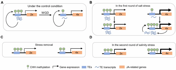 该研究发现与二倍体水稻相比,四倍体水稻减少钠离子的吸收,在盐胁迫环境中有更强的存活能力。在四倍体水稻中,基因组的许多位点包括逆境胁迫相关基因的DNA甲基化水平下降(图1A)。盐处理后,低甲基化状态导致四倍体水稻中盐胁迫相关基因(茉莉酸合成和信号转导基因等)更大幅度地激活(图1B),积累更多的茉莉酸-异亮氨酸。同时,四倍体水稻中逆境胁迫相关基因的激活会诱导邻近转座子的激活,引起转座子区域甲基化水平升高,以抑制转座子,维持基因组的稳定性(图1B)。四倍化后DNA甲基化水平下降加强对逆境胁迫的响应,而逆境胁迫后甲基化水平升高抑制转座子和临近的逆境胁迫相关基因的表达。这种反馈调控作用增强了四倍体水稻对盐胁迫的适应能力。在去除盐胁迫后,四倍体水稻会部分恢复低甲基化状态(与二倍体相比)(图1C)。当再次受到盐处理时,四倍体水稻中逆境胁迫相关基因的激活幅度仍明显高于二倍体水稻(图1D)。而且,两种不同四倍体水稻都呈现这种DNA甲基化和逆境胁迫相关基因表达的调控机制,表明其普遍性。