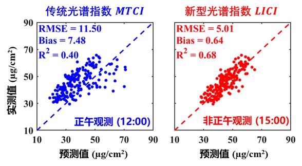 传统光谱指数正午观测结果(左)和新型光谱指数非正午观测结果(右)的比较