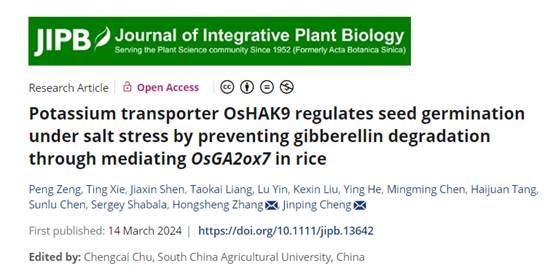 《Journal of Integrative Plant Biology》发表张红生教授团队“Potassium transporter OsHAK9 regulates seed germination under salt stress by preventing gibberellin degradation through mediating OsGA2ox7 in rice”