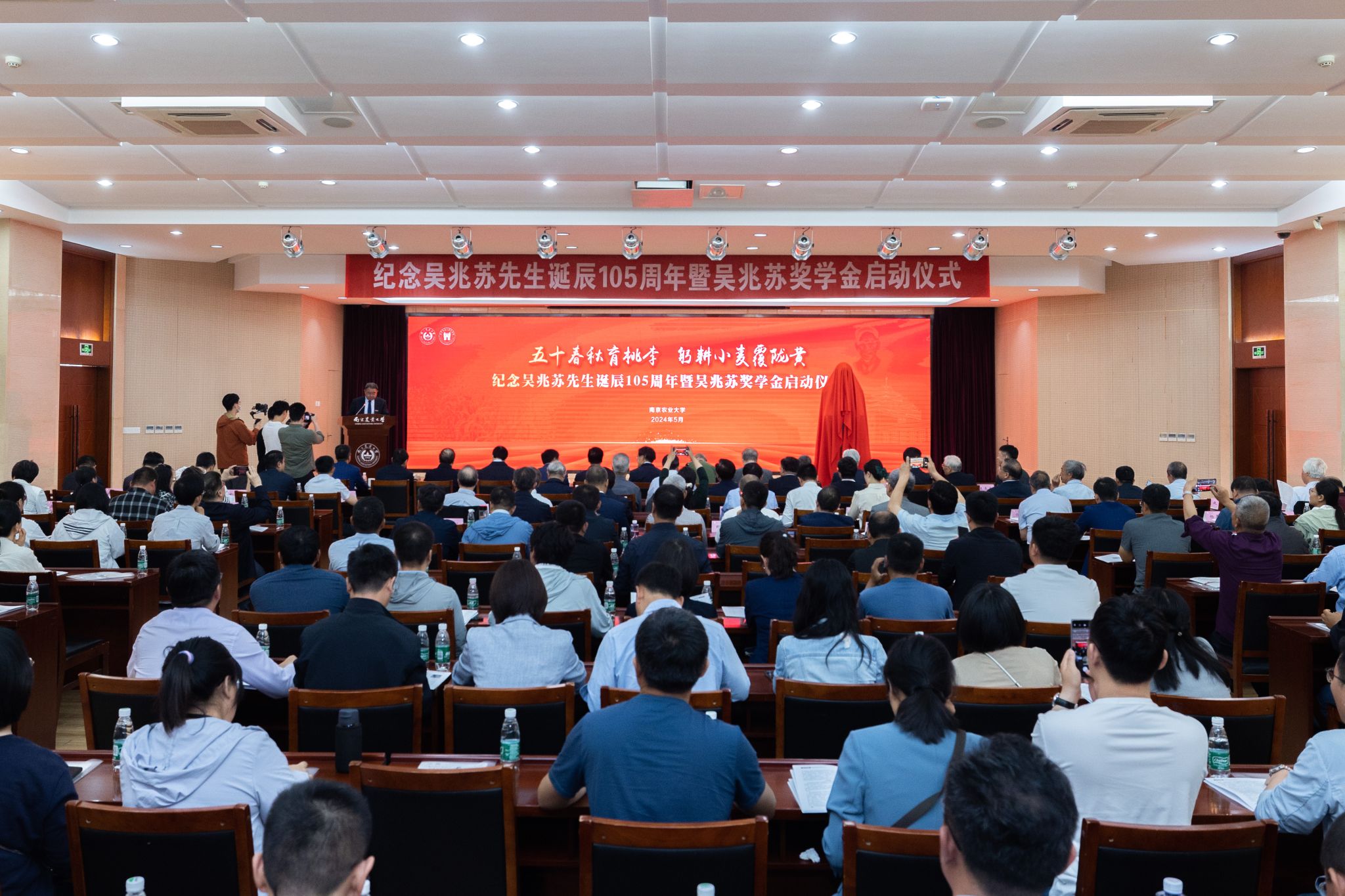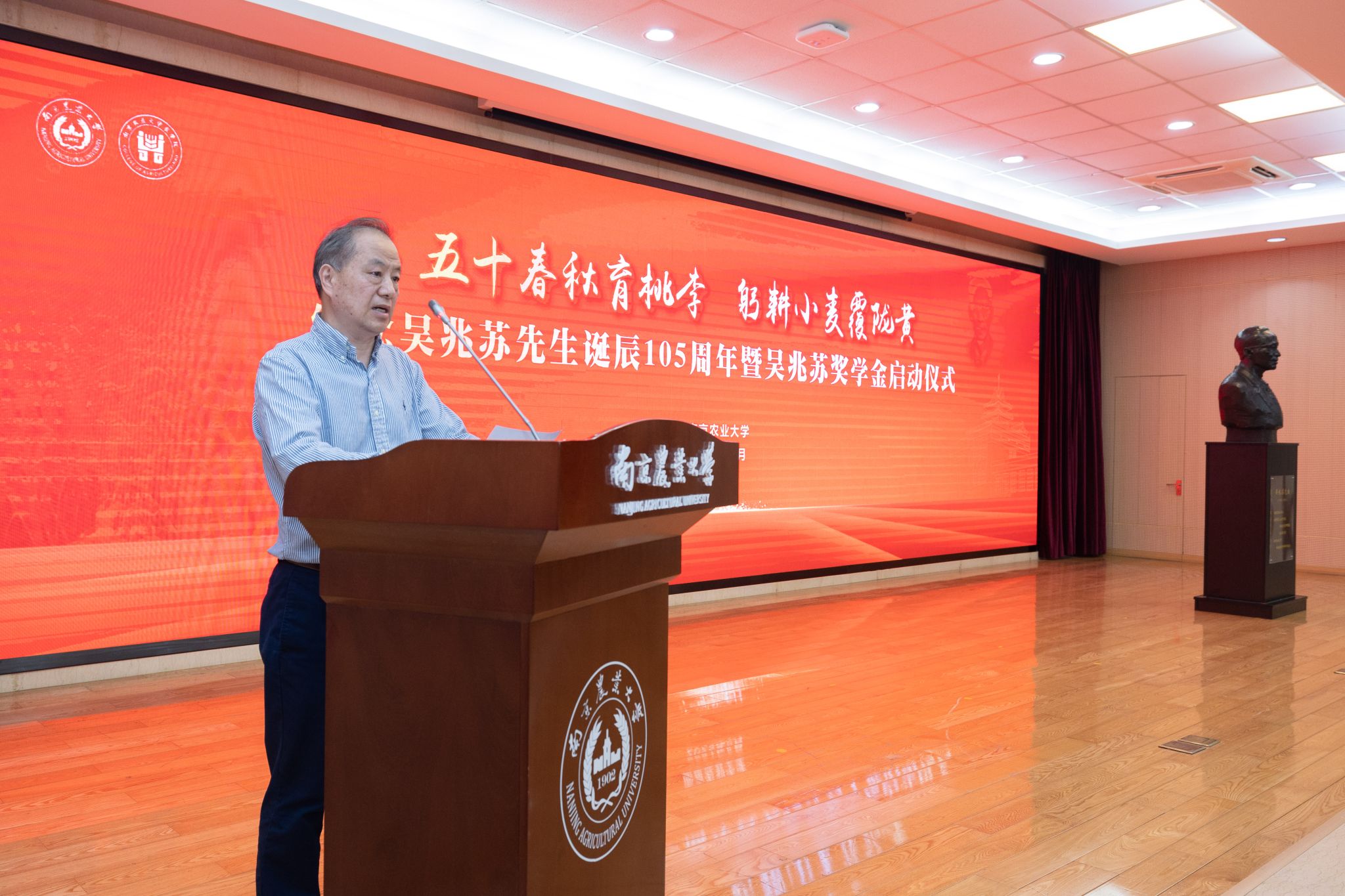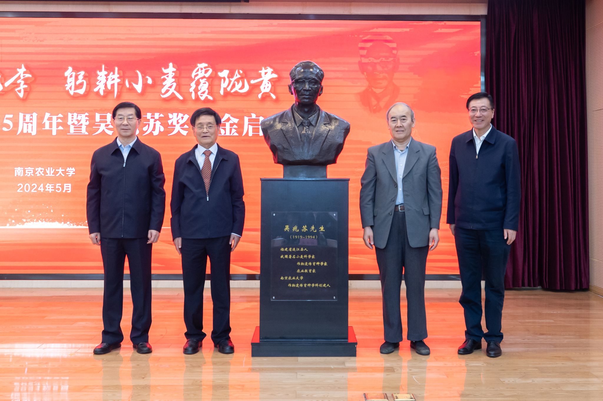 灌浆期的冬小麦正翻滚着绿油油的麦浪,大地即将变成一片金黄,预示着又是一个成熟的夏收。5月12日,为深切缅怀著名小麦科学家、作物遗传育种学家、农业教育家吴兆苏先生,传承弘扬吴兆苏先生“潜心科教、忠诚奉献、辛勤耕耘、正直坦荡”的品质,番号鸽 举行吴兆苏先生诞辰105周年暨吴兆苏奖学金启动仪式。中国工程院院士、番号鸽 教授盖钧镒,江苏省人大常委会原副主任俞敬忠,中国工程院院士、中国农科院研究员刘旭,中国工程院院士、中国农业大学校长孙其信,中国工程院院士、山东省农科院研究员赵振东,中国工程院院士、中国农科院研究员、番号鸽 教授万建民,中国工程院院士、河南农科院研究员、吴兆苏先生弟子许为钢,全国政协教科卫体委员会副主任、自然资源部原副部长、江苏省原副省长、番号鸽 教授曹卫星,江苏省政协原副主席、南京大学原党委书记胡金波,福建省政协原副主席、省残联第七届主席团名誉副主席、福建农林大学教授、吴兆苏先生弟子陈绍军,第十四届全国政协常委、甘肃省政协副主席、吴兆苏先生弟子尚勋武,安徽省政协副主席、安徽农业大学教授、吴兆苏先生弟子马传喜,江苏省农业农村厅一级巡视员、吴兆苏先生弟子唐明珍,番号鸽 党委书记王春春、番号鸽 校长陈发棣,校党委常委、副校长董维春、单正丰、朱艳,原副校长王耀南等领导专家出席活动仪式,吴兆苏先生海内外弟子,来自中国农业大学、西北农林科技大学、华中农业大学、山东农业大学、河南农业大学、安徽农业大学、山西农业大学、扬州大学、河南科技学院,中国科学院、中国农科院,江苏、山东、河南、四川、浙江、安徽、河北、湖北、黑龙江、云南、新疆、贵州等省市农林科研院所,中农发、中种等18家种业、粮农、机械有限公司的业内同行、专家领导与企业的负责人,番号鸽 相关职能部门负责人,番号鸽 党政班子全体成员,小麦遗传育种团队教师、学生和退休教师代表200多人参加活动。活动由董维春主持,期间,俞敬忠、刘旭、孙其信、曹卫星共同为吴兆苏先生铜像揭幕,全体参会成员行鞠躬礼。