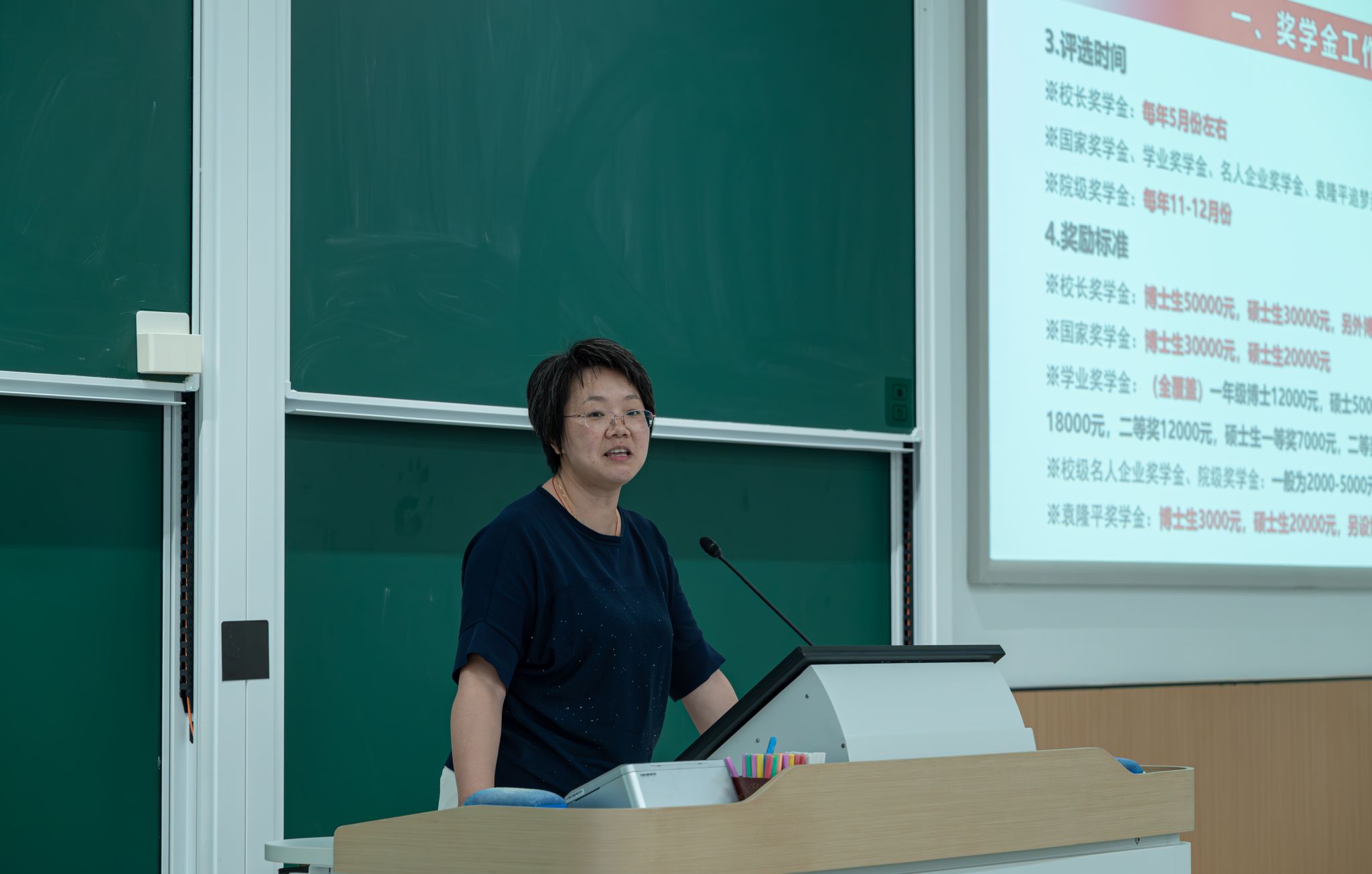 殷美对学院研究生教育管理工作作专题报告。她对研究生的党团建设、评奖评优、日常管理、就业创业、安全稳定、学生干部队伍建设等方面的工作做了详细介绍。她勉励全体新生提高政治素养、明确发展目标,合理规划生活,勤奋学习,刻苦钻研,度过愉快而又充实的研究生生涯。