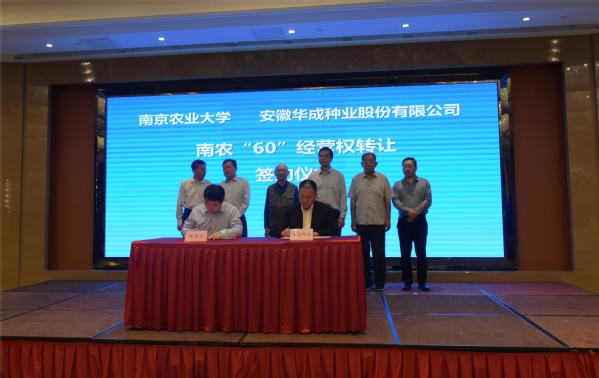 会上举行了“南农60”“南农57”两个大豆新品种的品种经营权转让签约仪式,“南农60”以1500万元价格转让给安徽华成种业股份有限公司,“南农60”,适宜于黄淮海南片大豆新品种,具有较强耐荫性,适宜大豆玉米复合带状种植。“南农57”以200万元价格转让给安徽柳丰种业科技有限责任公司,“南农57”,高油高产大豆新品种,粗脂肪含量20.44%。会后组织开展了“南农60”和“南农47”绿色高产栽培观摩活动。