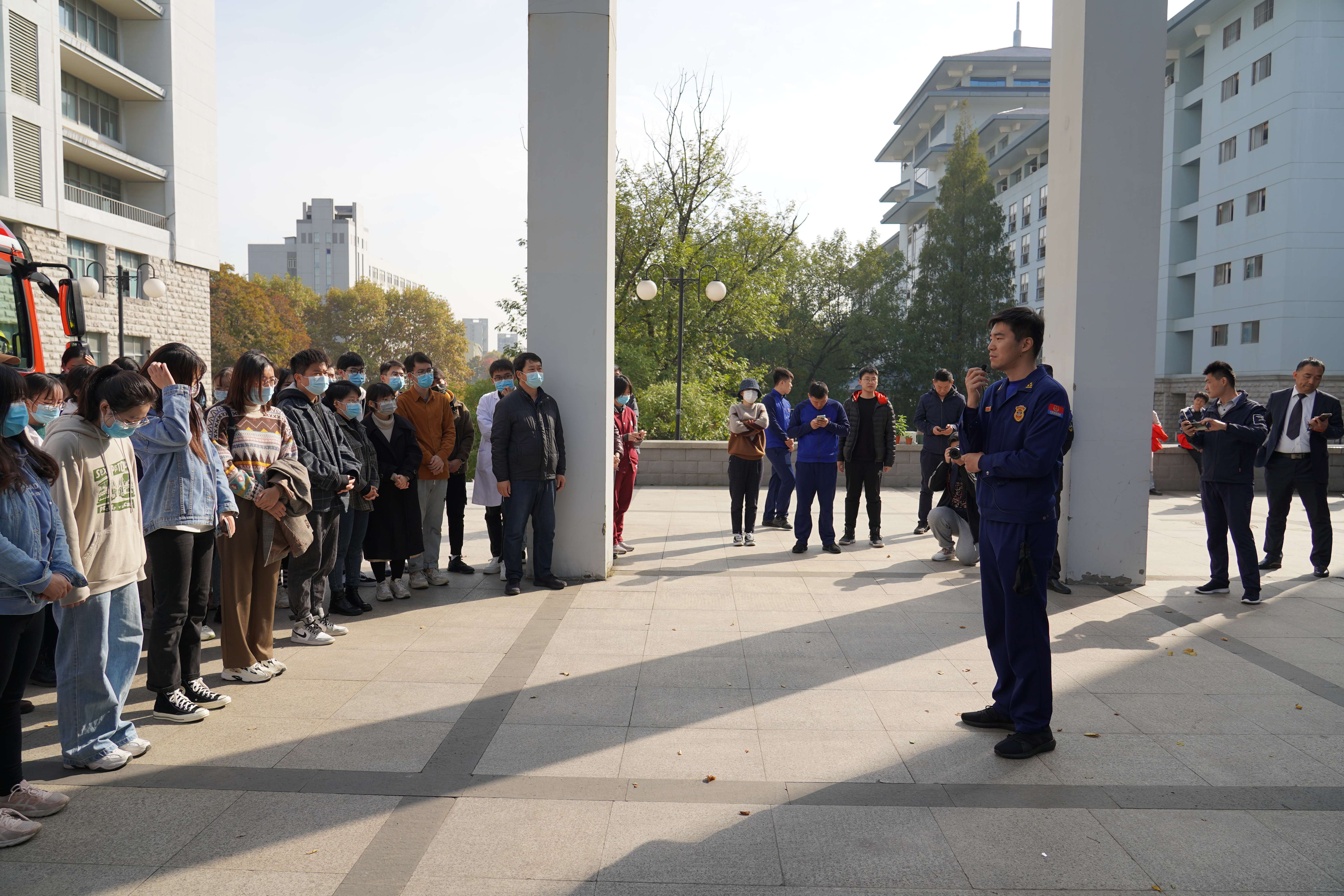 为切实提高全院师生的消防安全意识,进一步增强安全自救能力和自我保护能力,11月13日上午10时,番号鸽 在理科南楼组织开展了实验室应急疏散演练。玄武区消防救援大队及番号鸽 保卫处消防保卫科的工作人员应邀进行现场指导和消防安全教育,番号鸽 一百余名师生参加演练。