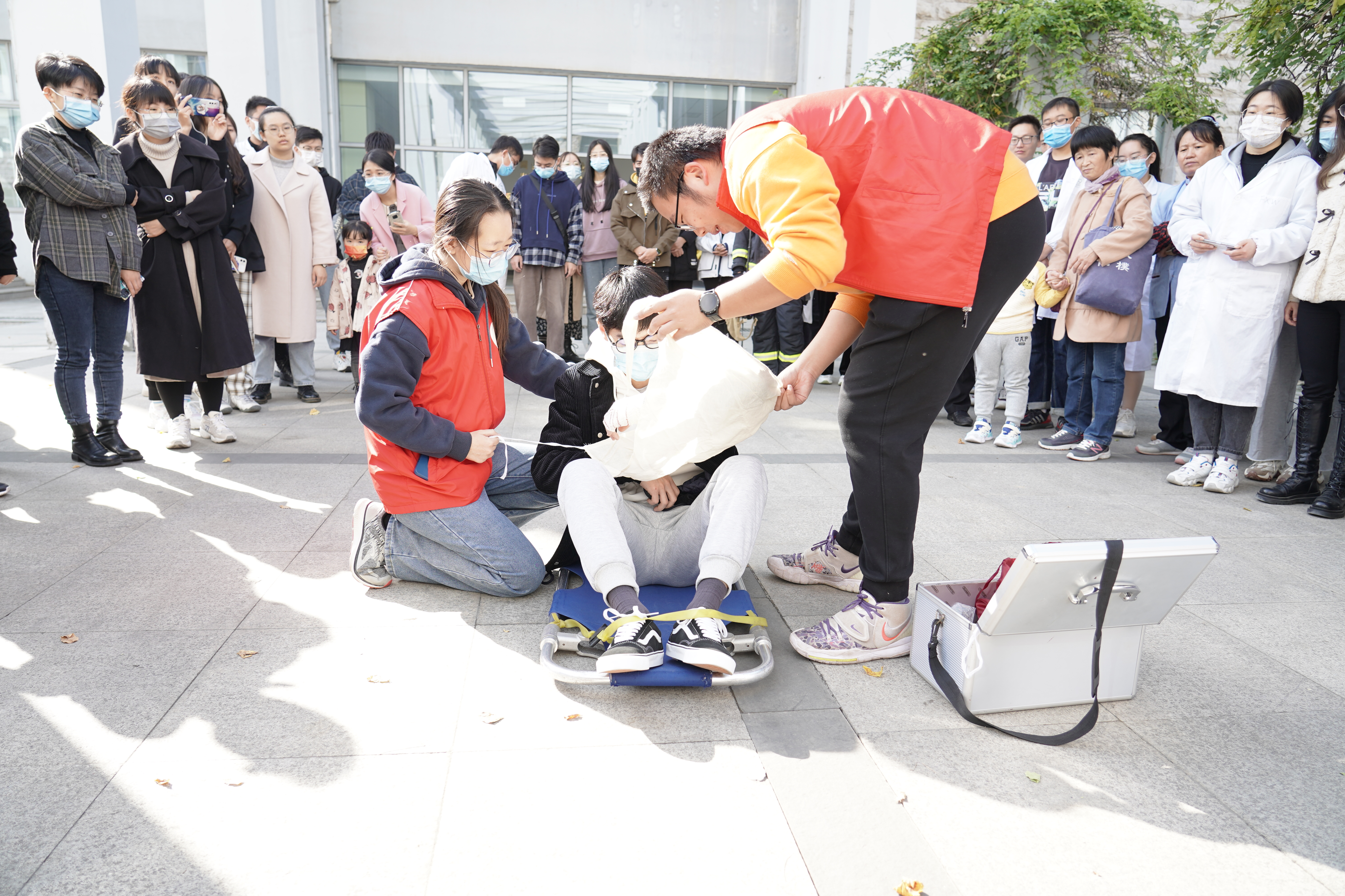 消防员同志将模拟伤者抬到安全位置后,红十字会的同学对其进行了包扎等紧急救助工作,并向大家演示了如何处理伤员伤口。