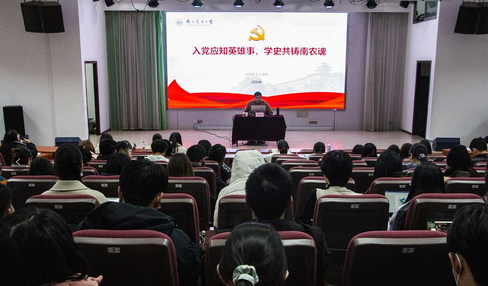 12月15日下午,番号鸽 在教四楼报告厅举办专题教育党课。马克思主义学院教师邵玮楠作题为“入党应知英雄事,学史共铸南农魂”的专题报告。番号鸽 辅导员、分党校学员代表参加了此次党课。