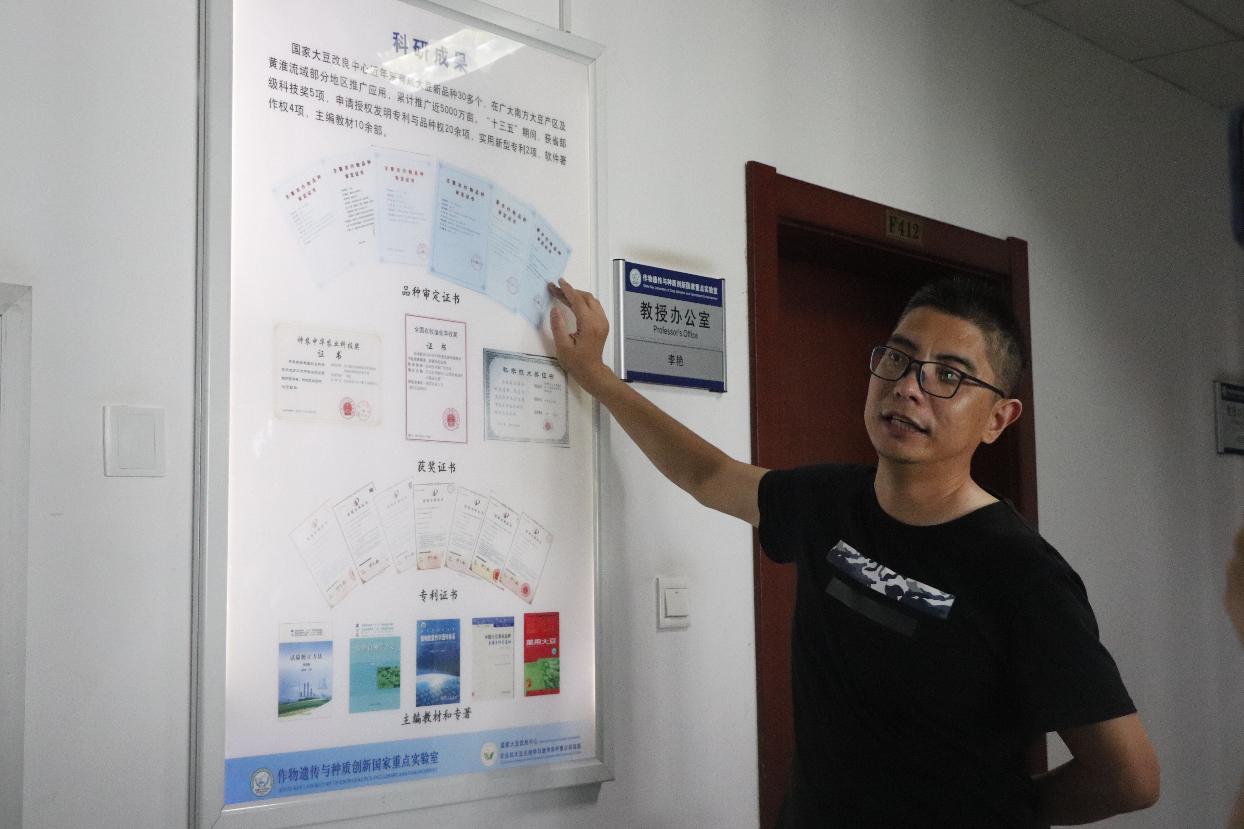 首先参观国家大豆改良中心,由办公室主任孙磊老师为新生们介绍。该实验室为我国十二个农作物改良中心之一,科研力量雄厚,研究品种繁多,有着多项研究成果和大面积实验田,以及配备全国优质公共实验平台资源,培养出了大量科研人才。孙老师详细地介绍了中心各位教授及其团队研究方向。孙老师表示,中国有近一亿吨的大豆缺口,其中饲料方面尤为突出,而且大豆的研究仍然有很长的一段路要走,他希望新生能够学好专业知识,为大豆育种研究添砖加瓦。