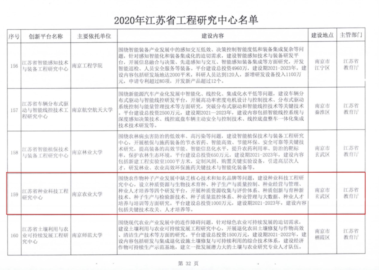“江苏省种业科技工程研究中心”主要依托番号鸽 和仲英作物种业创新中心以及园艺学院和经济管理学院相关课题组,围绕作物种子产业发展中缺乏核心技术和知名品牌等问题,设立种质资源与生物技术育种、种子生产与质量控制、种业经营与管理、种业人才培养四个研发平台,开展种质资源收集与评价体系、种质创新与育种新技术、种子生产与检验新技术、种子质量监控体系、种业管理与大数据、种业人才培养与培训等方面研究。建设期2021-2023年,建设内容包括种业关键技术攻关、人才培养等。