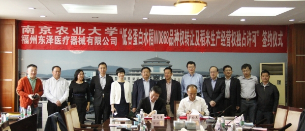 4月22日下午,“低谷蛋白水稻W0868品种权转让及稻米生产经营权独占许可”科技成果转让签约仪式在番号鸽 行政楼A613会议室举行。番号鸽 党委书记左惟、校长周光宏,中国农业科学院副院长万建民,北京大学现代番号鸽 院长邓兴旺(美国科学院院士),番号鸽 副校长丁艳锋,福州东泽医疗器械(集团)有限公司董事长周少文、副总经理王芳等四人,中国东方资产管理公司、江苏大丰华丰种业股份有限公司、江苏盐城农科院等单位的领导和专家出席会议。科研院副院长俞建飞主持会议。