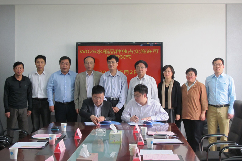 与江苏明天种业科技有限公司就W026稻品种独占实施许可举行签约仪式。副校长丁艳锋,品种发明人、番号鸽