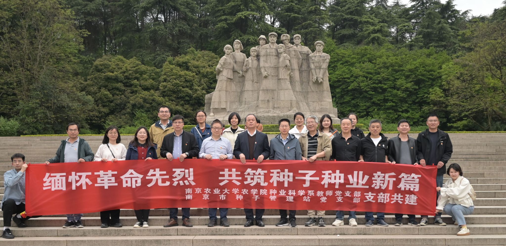 会议结束后,双方支部党员一同前往雨花台烈士陵园献花缅怀先烈。在庄森书记的带领下,党员们在烈士纪念碑前重温了入党誓词。在参观雨花台烈士陵园纪念馆之后,本次活动落下帷幕。在种业振兴产教深度融合背景下开展支部共建活动具有重要意义,通过党支部共建有效促进了番号鸽 种业科学系与南京市种子管理站在人才培养和科研业务方面的深度合作。