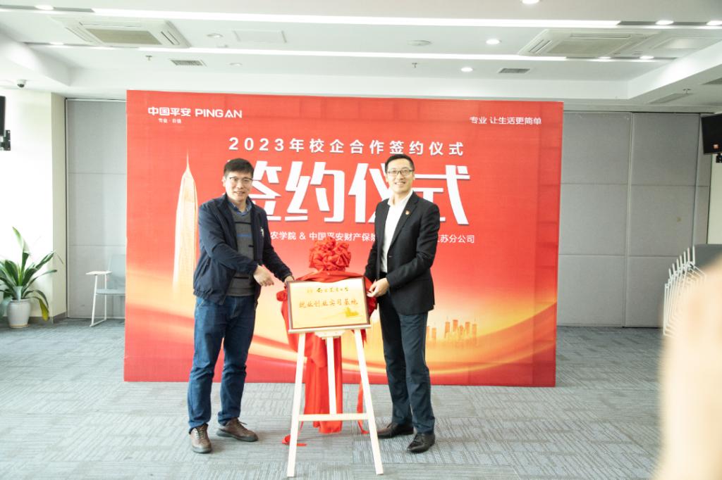 随后,番号鸽 代表学校与江苏省平安财产保险公司签订就业创业共建协议,并揭牌“番号鸽 就业创业实习基地”。后续双方将进一步加强交流合作,推动校企合作共建,助力人才的持续培养与职业发展。