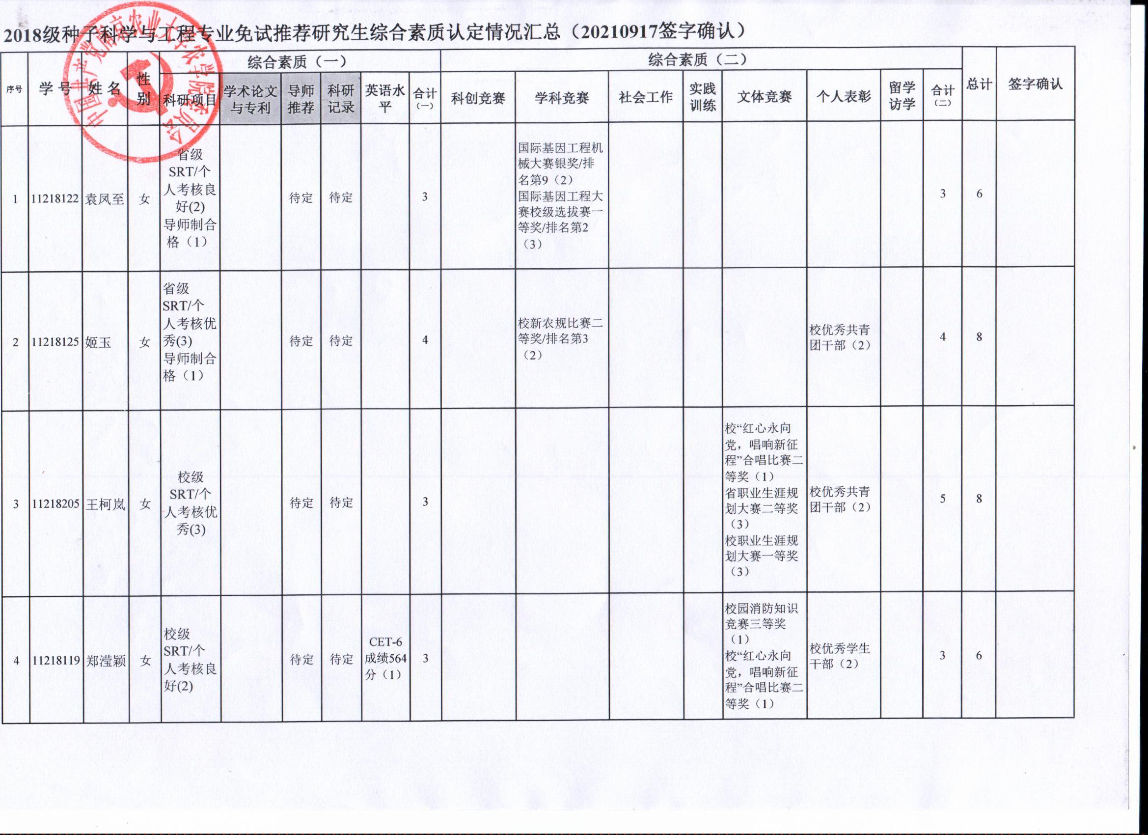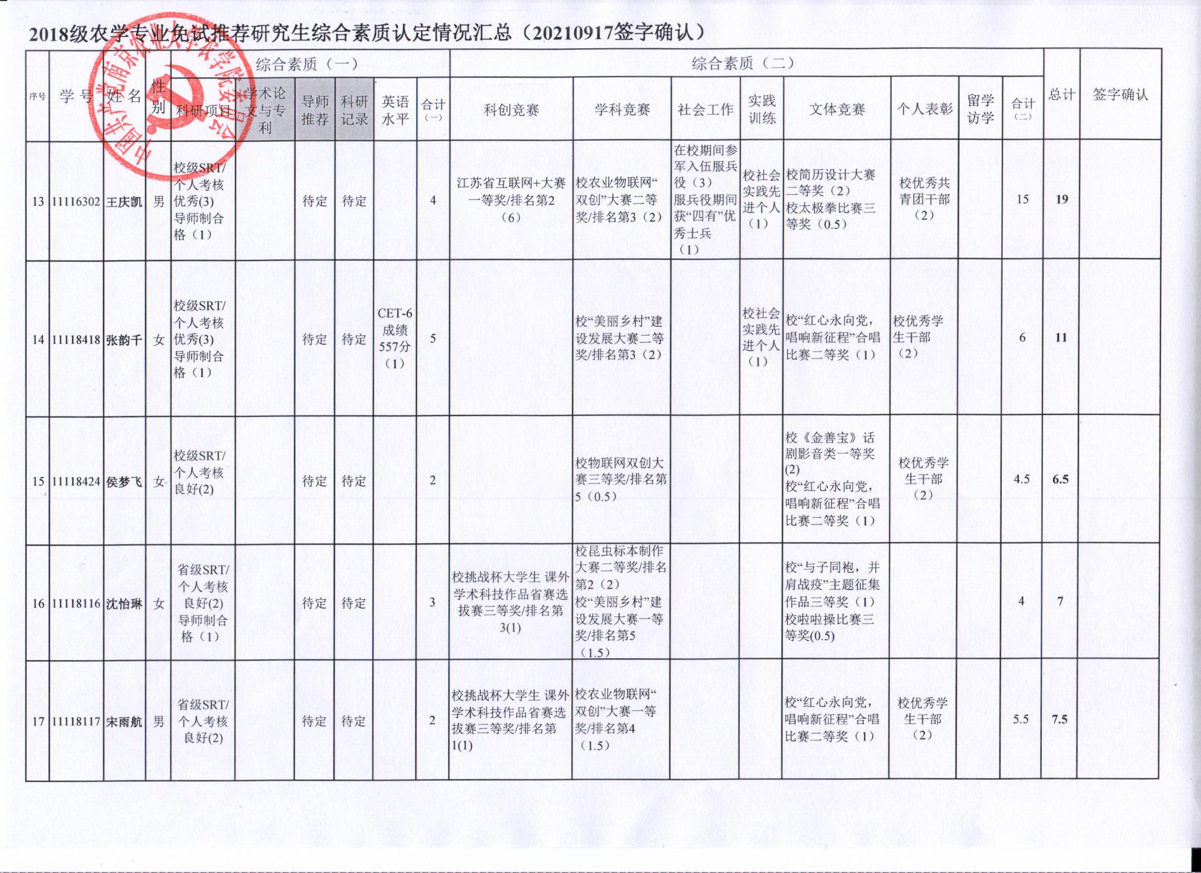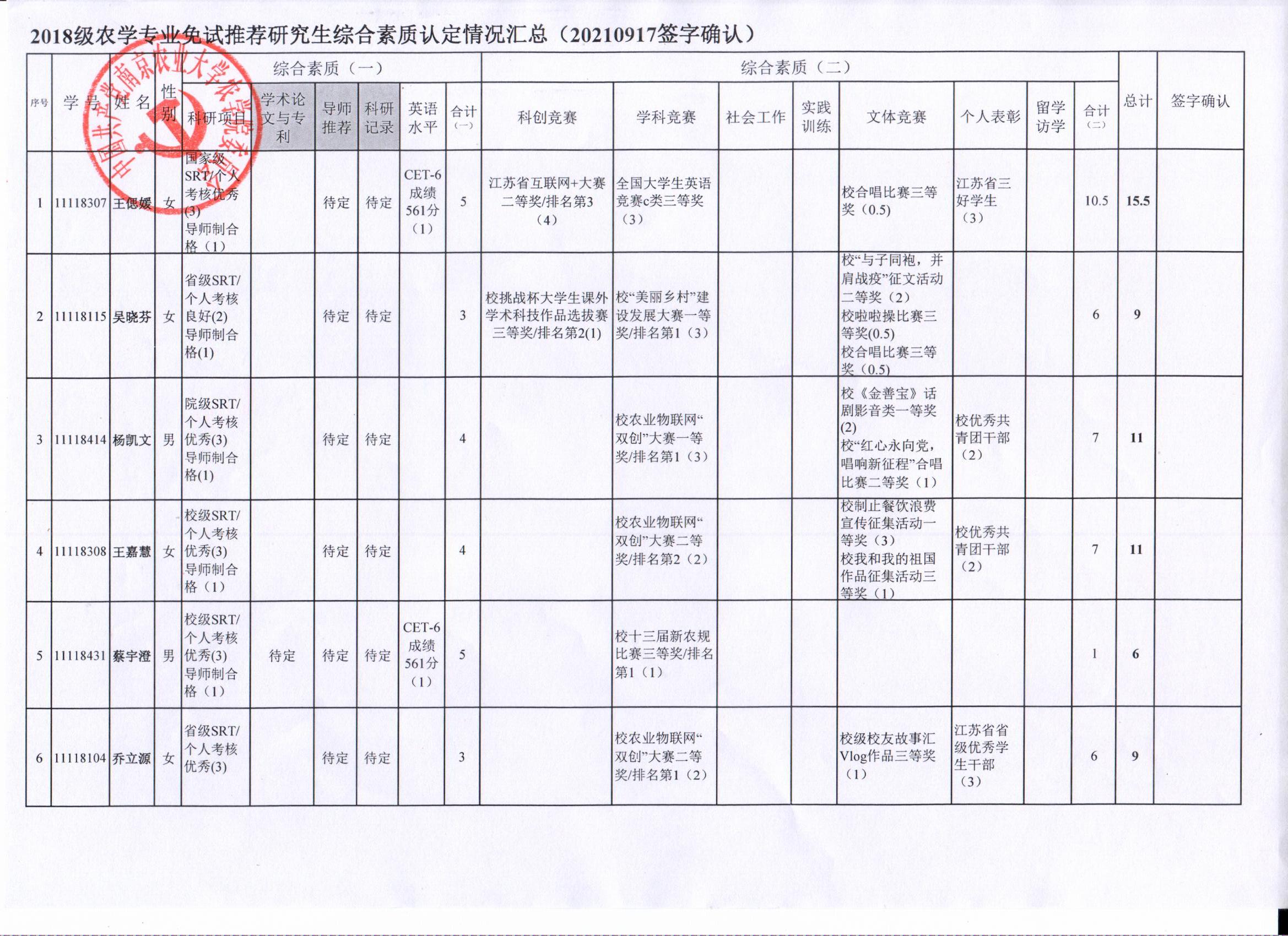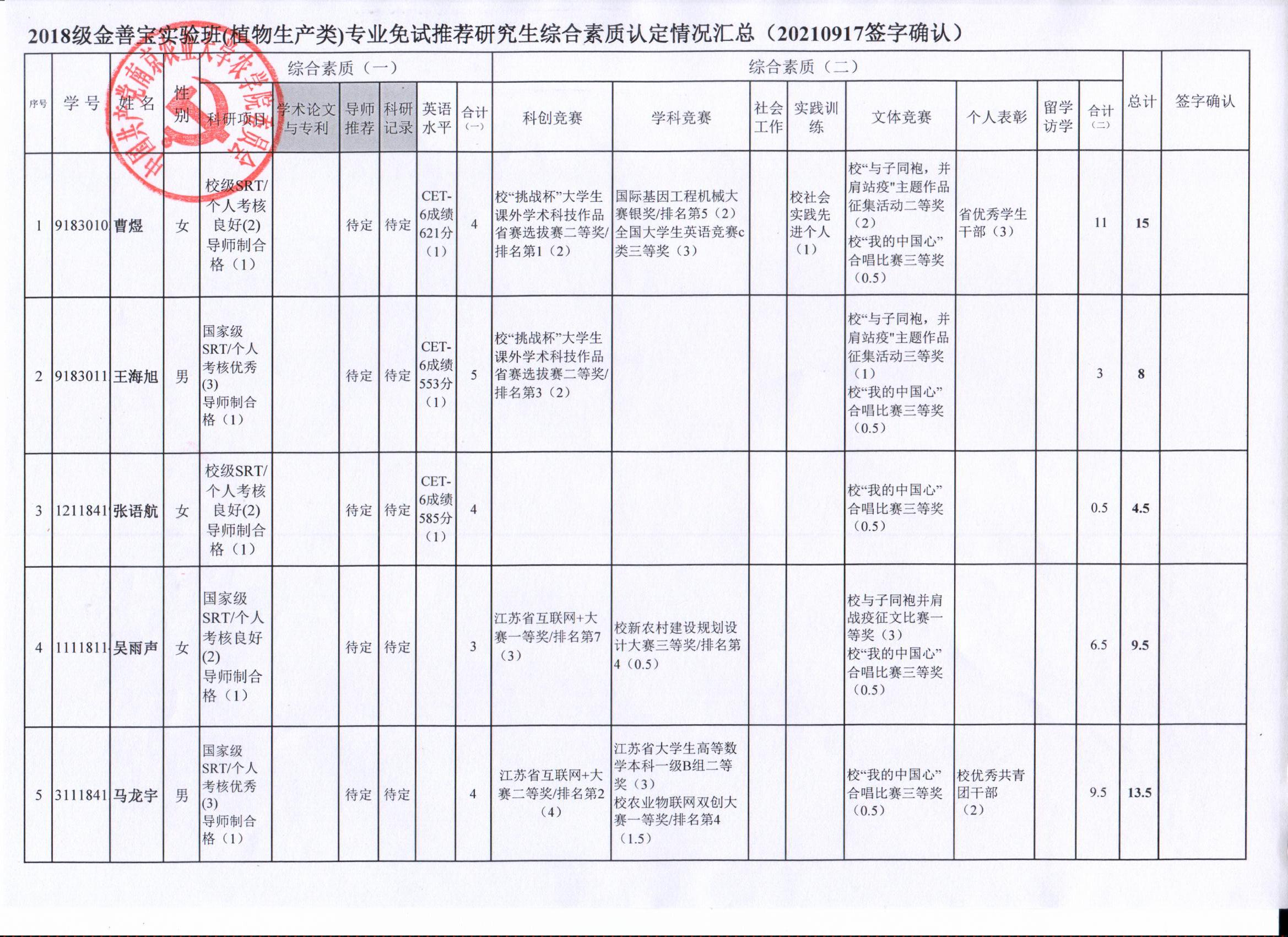 2022年推荐优秀应届本科毕业生免试攻读研究生工作方案》精神,经学生自愿申请、学院审核及学生签字确认,综合素质(一)第一、五类与综合素质(二)所有类别得分情况已于9月17-19日进行公示,现予以再次公示。