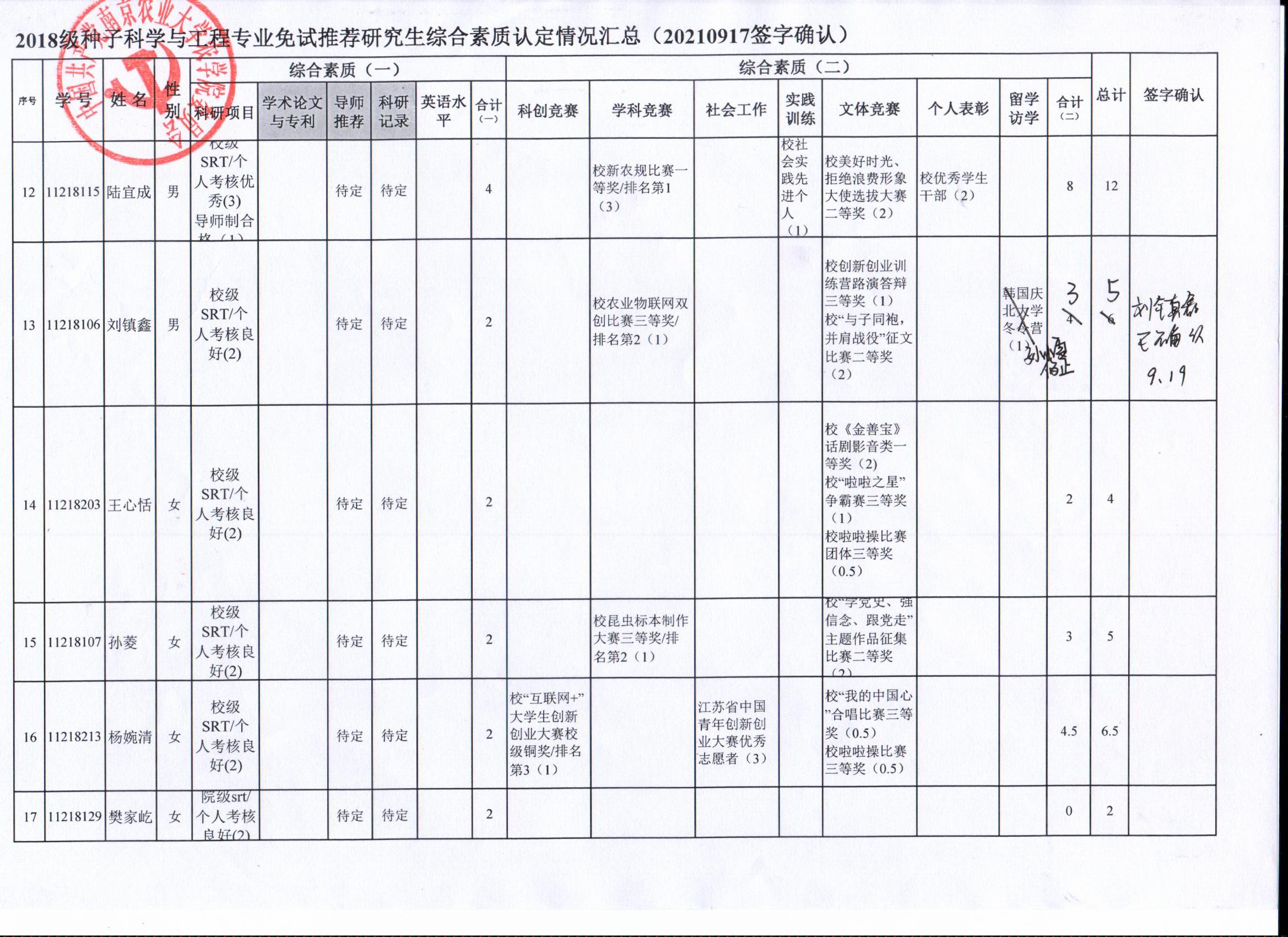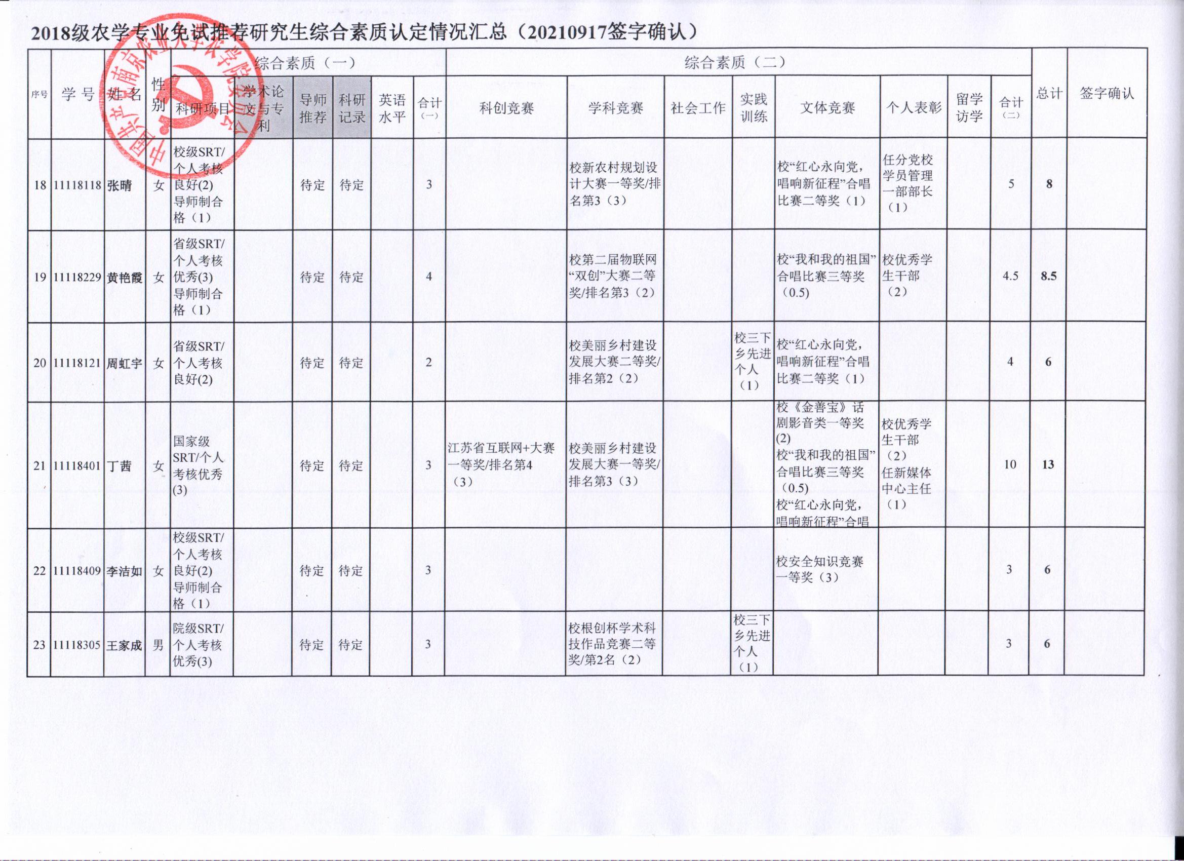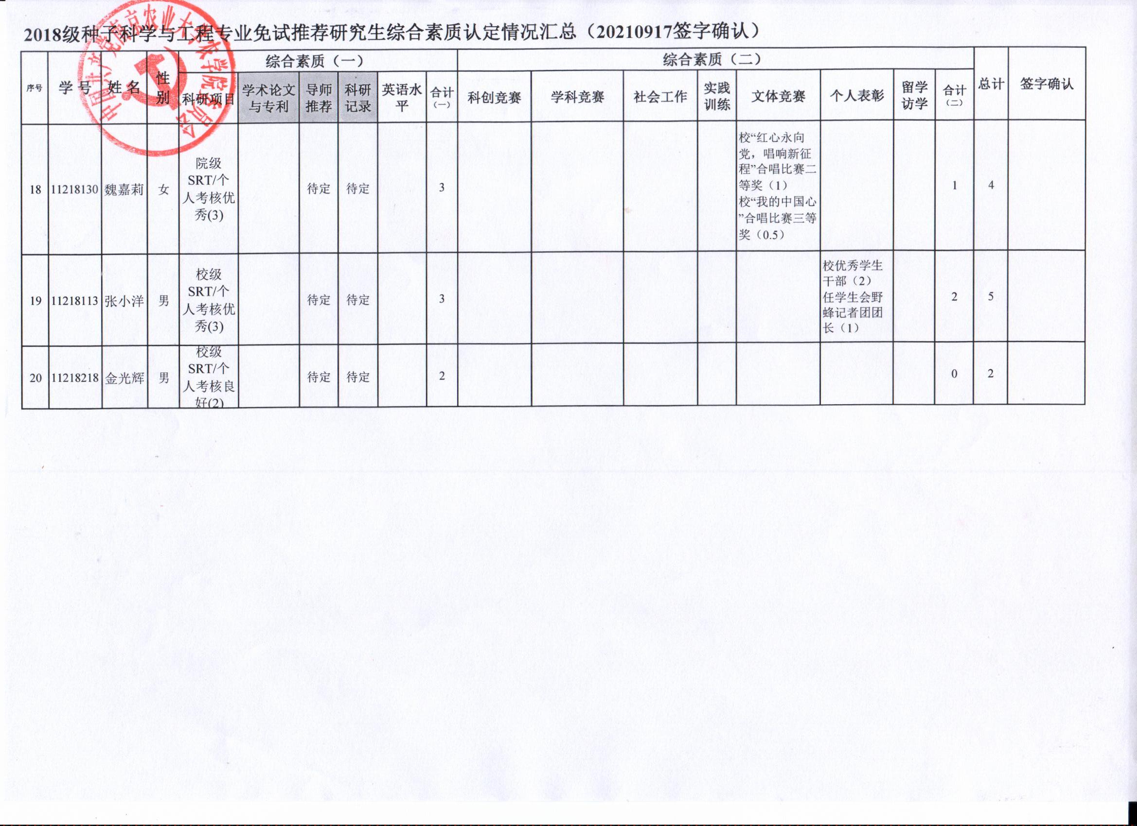 2022年推荐优秀应届本科毕业生免试攻读研究生工作方案》精神,经学生自愿申请、学院审核及学生签字确认,综合素质(一)第一、五类与综合素质(二)所有类别得分情况已于9月17-19日进行公示,现予以再次公示。