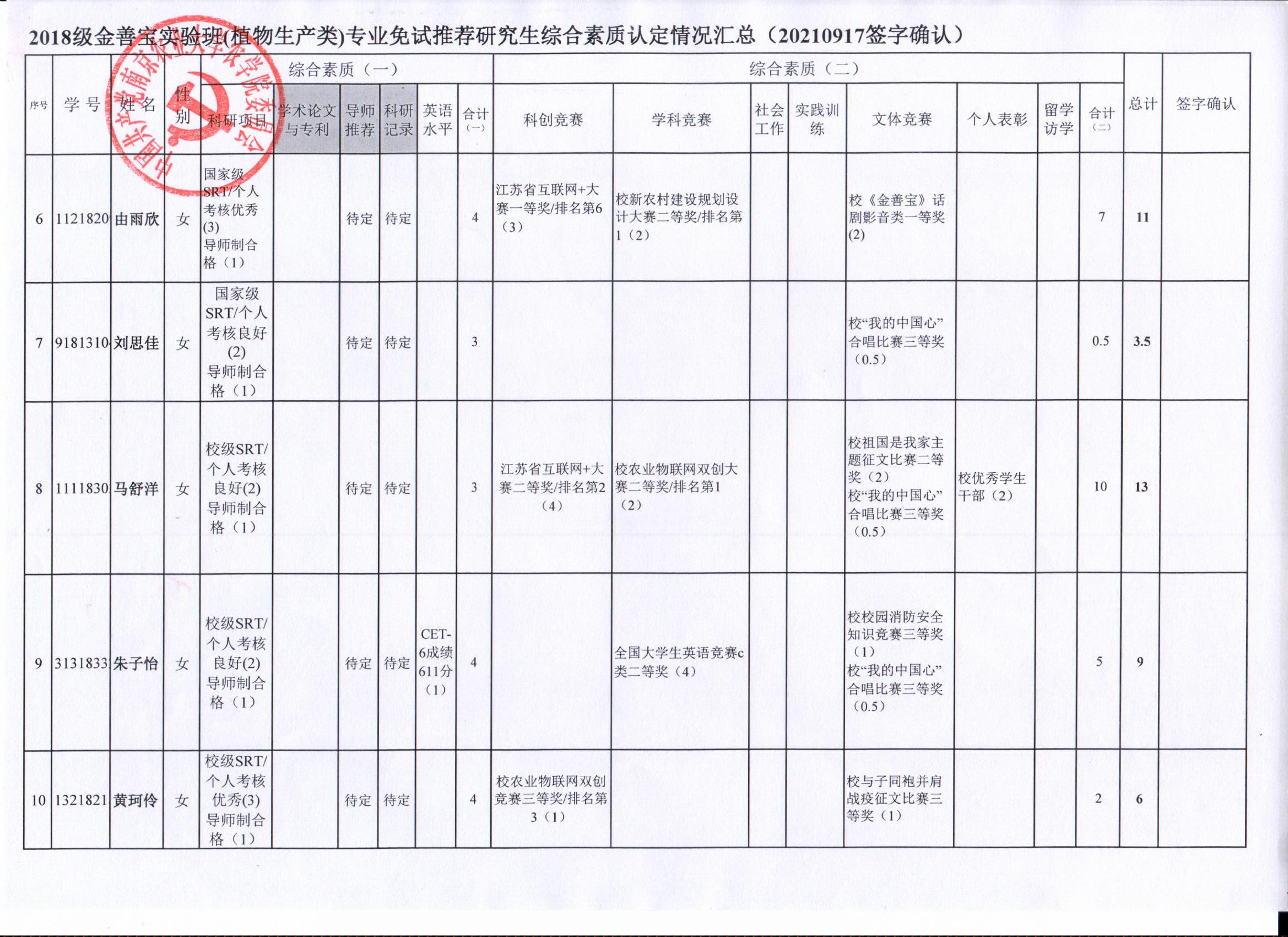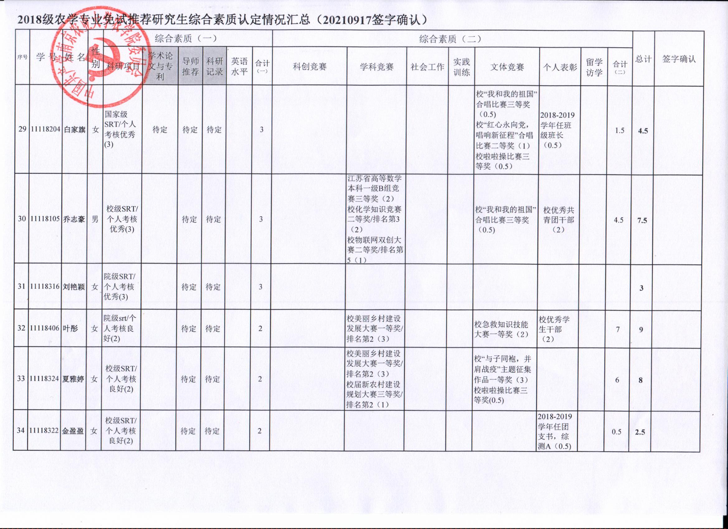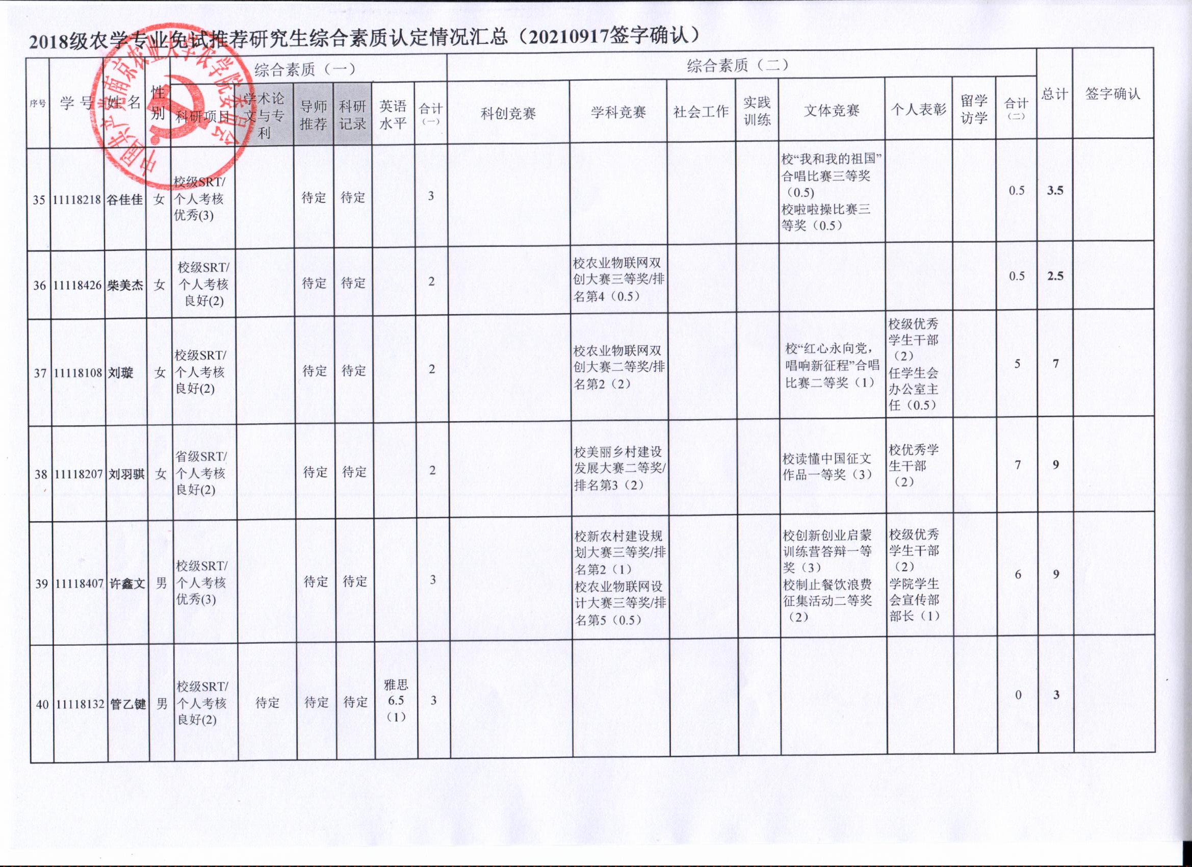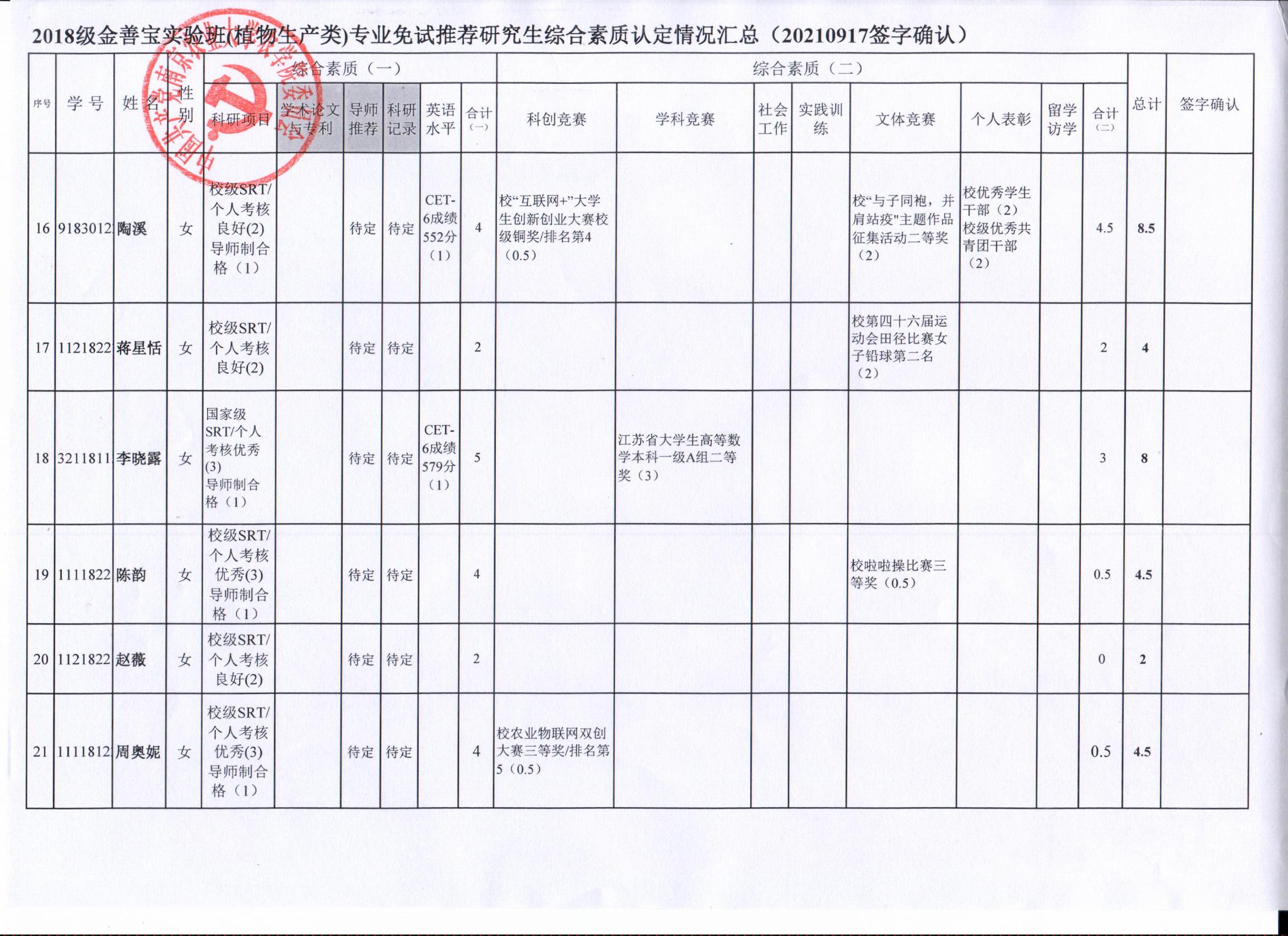2022年推荐优秀应届本科毕业生免试攻读研究生工作方案》精神,经学生自愿申请、学院审核及学生签字确认,综合素质(一)第一、五类与综合素质(二)所有类别得分情况已于9月17-19日进行公示,现予以再次公示。