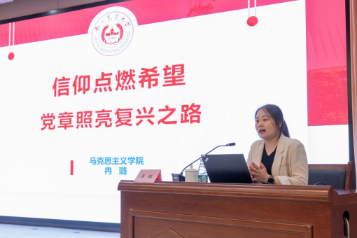 最后,冉璐老师系统梳理党章百年演进脉络,从中共一大党纲擘画建党方略,到七大党章确立毛泽东思想为指导思想,实现马克思主义中国化的首次理论飞跃;从十二大党章开启"依章治党"新纪元,到十九大将习近平新时代中国特色社会主义思想载入党章,标注马克思主义中国化时代化的新高度;直至党的二十大党章将"中国式现代化""全过程人民民主"等重大理论创新成果制度化,展现了党在不同历史时期将实践经验上升为理论成果、再用科学理论指导新的实践的螺旋式上升过程。她指出,同学们要将党章中"全心全意为人民服务"的根本宗旨转化为"把论文写在祖国大地上"的价值追求,让青春在全面建设社会主义现代化国家的火热实践中绽放绚丽之花。