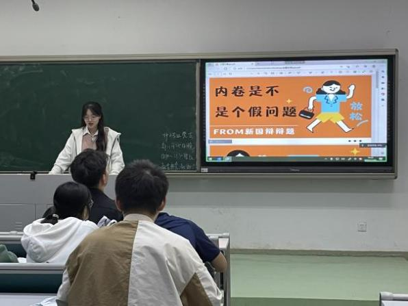 之后卢彦静同学和王剑柘同学进行了主题分享。卢彦静同学分享了如今我们大学生关心的热点问题——内卷,讲述了内卷这个词的由来,并结合一段新国辩的视频分享了内卷的存在是因为“人生无限而资源有限”造成的。王剑柘同学为大家简单介绍了《所以》这本小说,讲了主人翁叶紫一生的悲欢离合,并表达了这本书反映了我们普通人的真实生活状态的观点。