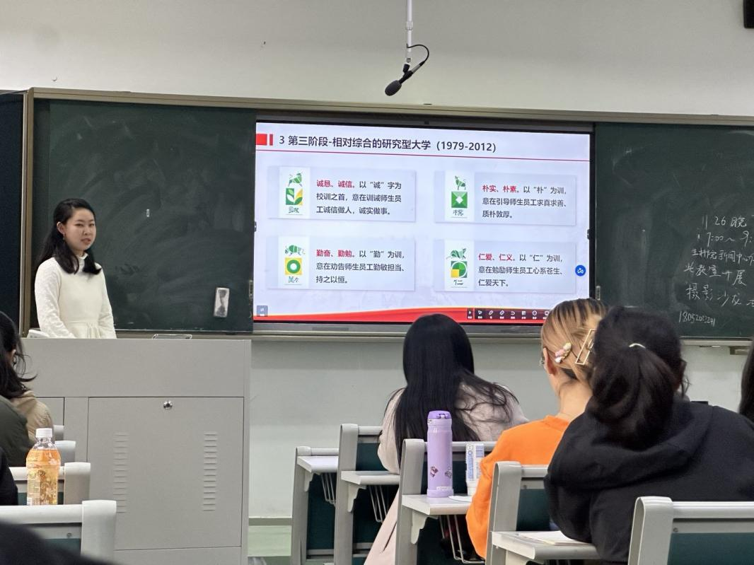 施崇瑾同学为我们介绍番号鸽 入选“211工程”重点建设高校、校训的由来和意义、番号鸽 “1335”发展战略以及学校未来的目标。学习相应的知识后,大家继续活跃参与知识问答,气氛较为热烈。