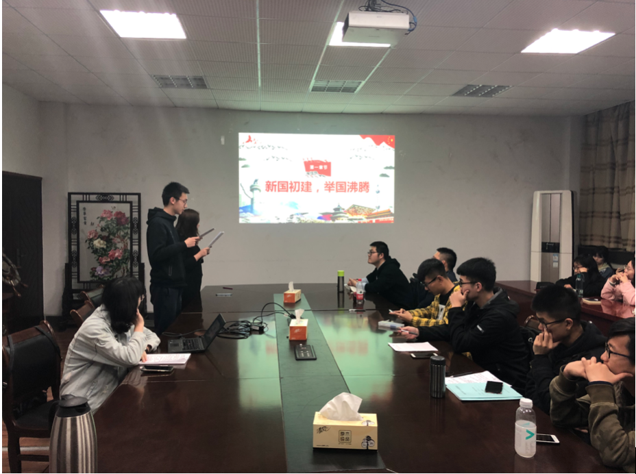 本次分班讨论之前,赵然同志组织支部新加入的积极分子进行了简单的自我介绍,增进了支部内成员的了解。张文姝作为此次分班讨论的串讲人对“我和祖国的成长故事”这一主题进行开场介绍,通过五个篇章讲述祖国的成长历程:第一篇章——新国初建,举国沸腾;第二篇章——摸石过河,艰辛探索;第三篇章——改革开放,国之崛起;第四篇章——不负众望,成果丰硕;第五篇章——展望未来,我和祖国一同成长。