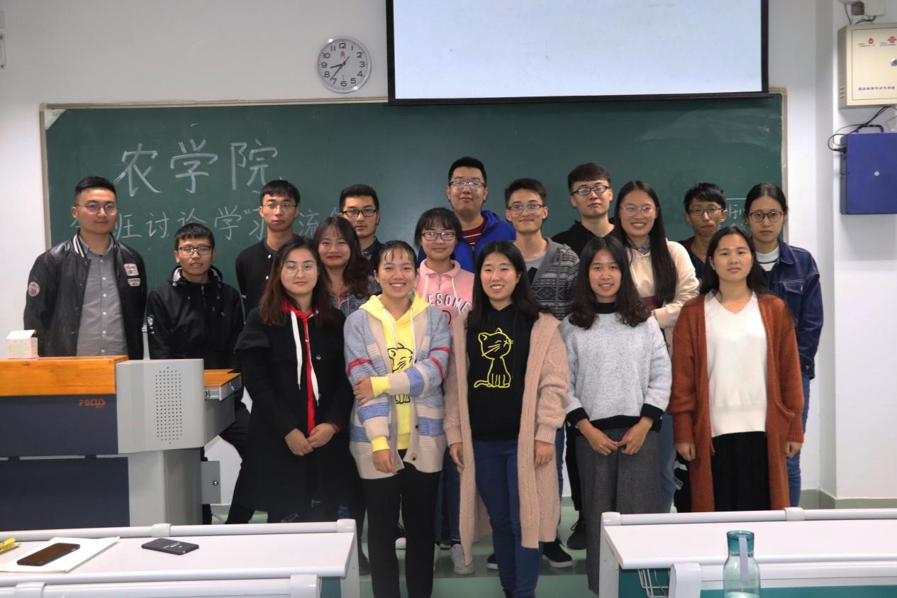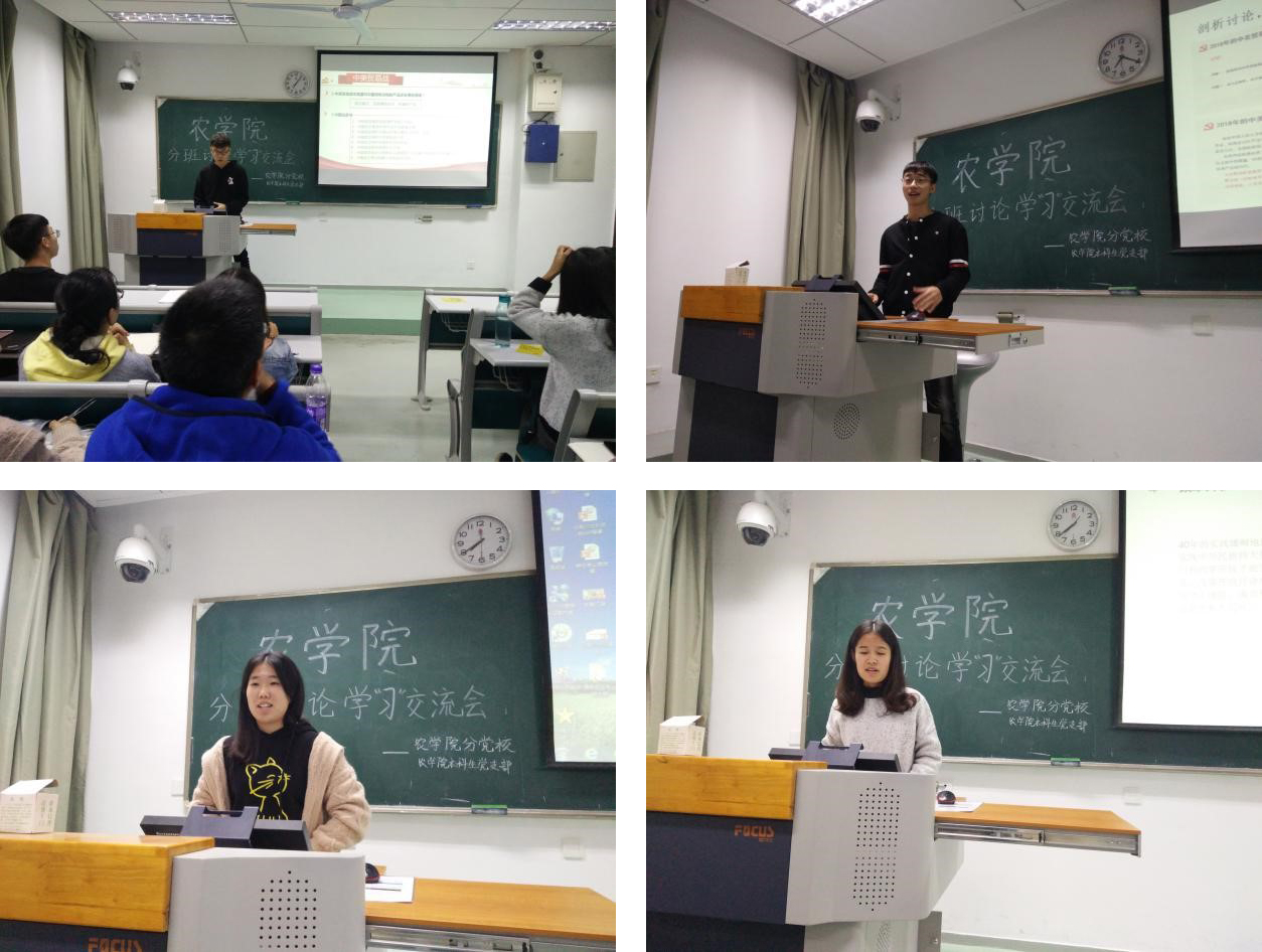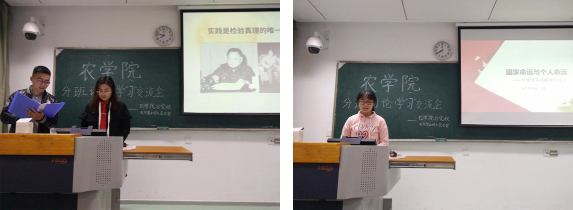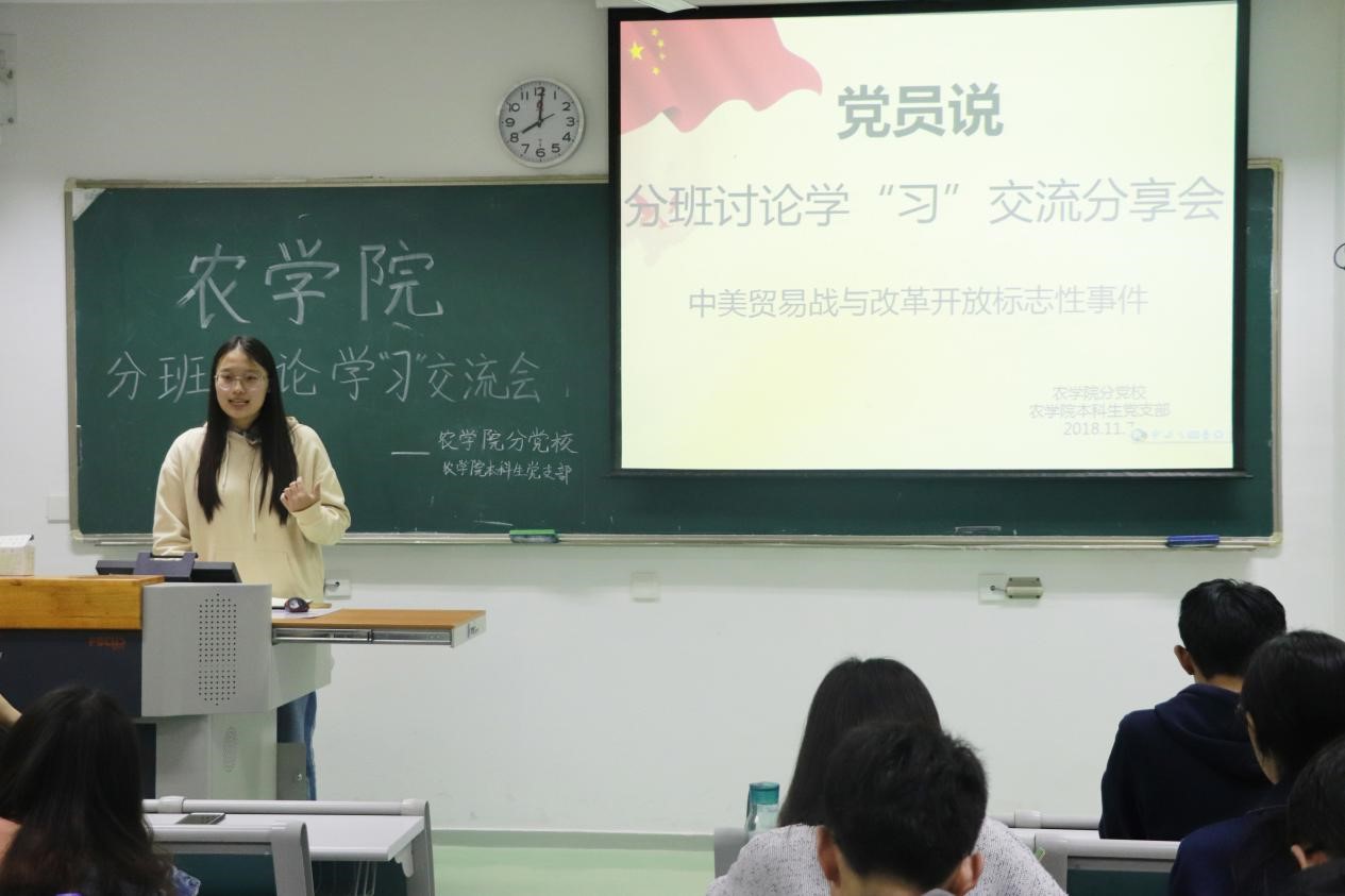 随后,农学专业一党支部书记赵然从支部分班讨论情况总览、分班讨论形式、学习重点、总结与反思等四个方面展开交流与分享,并就本支部特点提出想法与意见,认为分班讨论不应有局限性,应将其意义落到实处。农学专业二党支部书记李帛树以“一艘运载黄豆的大船”为切入点,为大家讲述中美贸易战的背景与发展,并提出时事讨论的新环节,向大家推荐了不同途径的学习资源。种子专业党支部书记贺微华虚心学习其他支部分班讨论的新形式,提出分班讨论应将介绍普及与学习思考相结合,从自身出发,关注社会时事。植物实验专业党支部书记张笑凡简单介绍支部发展,雷源同学从国家命运与个人命运的角度为大家解读中美贸易战及中国合理的应对;龚心如,宗旨同学以视频、朗诵的方式介绍改革开放四十周年的标志性事件,印象深刻。