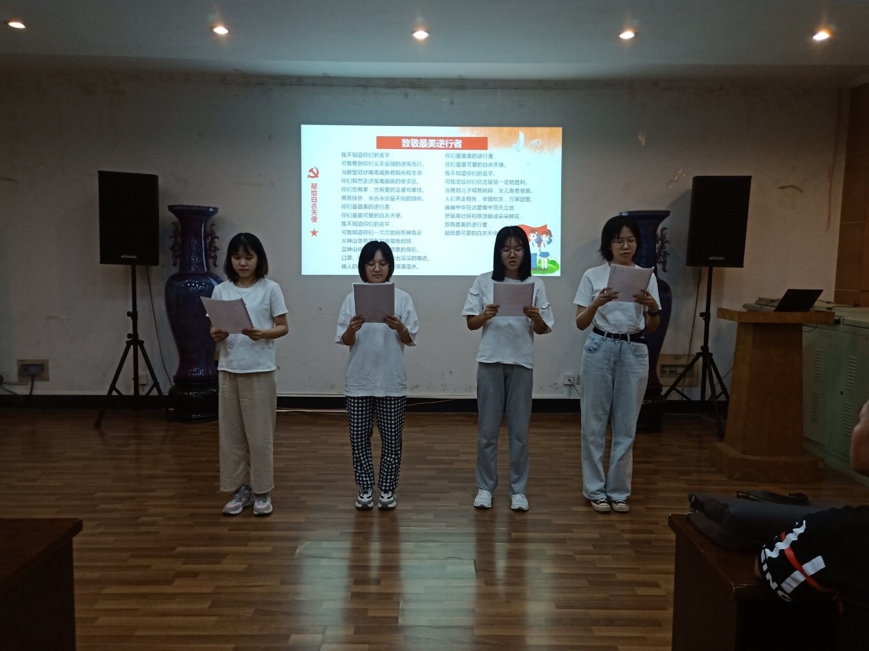 此次分班讨论会议主要由“抗击疫情全程速览”、“致敬国家功臣”、“全民抗疫”、“致敬最美逆行者”四个部分组成。在回顾中国抗疫故事的过程中,向四位在疫情期间为守护中国人民生命健康安全的四位国家功臣致敬,正是他们不惧病魔、冲在了疫情防控的最前线,以自身的奉献和担当为我们筑起了病毒防护的铜墙铁壁。番号鸽 的学生也在自己的家乡为抗击疫情而不懈努力着,这些中国的抗疫故事给了支部成员们深深的感触。