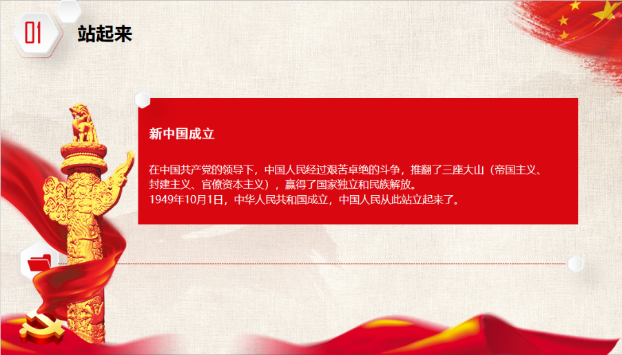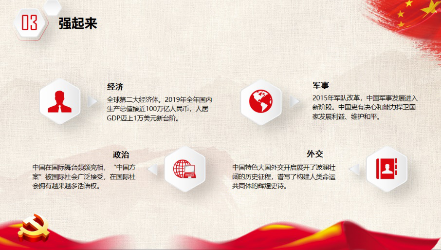 随后,陶溪同学和安敬威同学带领我们一起详细回顾了新中国的成长史。一部新中国的历史,就是中国共产党带领人民团结奋斗的历史。经历了旧民主主义革命和新民主主义革命的中国终于推翻了三座大山、赢得了国家独立和民族解放,在1949年这一历史时刻站起来了。站起来的中国人民继续发扬艰苦奋斗的革命精神,在改革开放的时代背景下,实现了经济实力和国际地位前所未有地提高,中华民族成功从站起来走向富起来了。进入新时代的中国并没有躺在过去的功劳簿上止步不前,党的十八大以来,在我党的正确领导下,中国特色社会主义进入新的发展阶段,在各个领域不断取得重大成就,意味着久经磨难的中华民族终于迎来了由富起来到强起来的历史性飞跃。