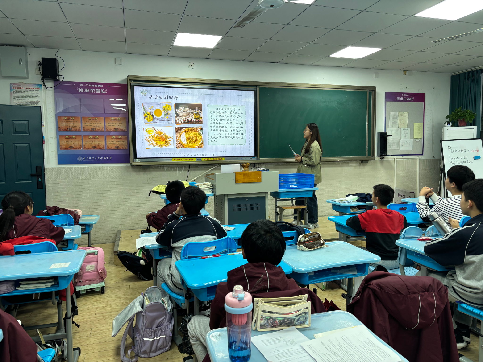 大豆富含蛋白质与脂肪,被誉为“地里长出来的肉”。主讲人通过对比图表,引导同学们观察大豆在国内外的生产与消费差异,并介绍了以王连铮同志为代表的科学家在提升国产大豆自给率方面的重要贡献。此外,同学们还对大豆在豆浆、豆腐、酱油等多种食品中的应用有了更全面的认识。