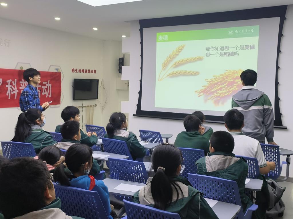 青年志愿者服务大队的组织下,有36名志愿者通过考核与筛选,共同组建了“听秾说”科普团队,在11月为孝陵卫中学的同学带来5场科普,并带领他们种植小麦南农06Y86、观察其生长过程。孝陵卫初级中学来自不同年级的36名中小学生参加了“耕·读”系列活动。