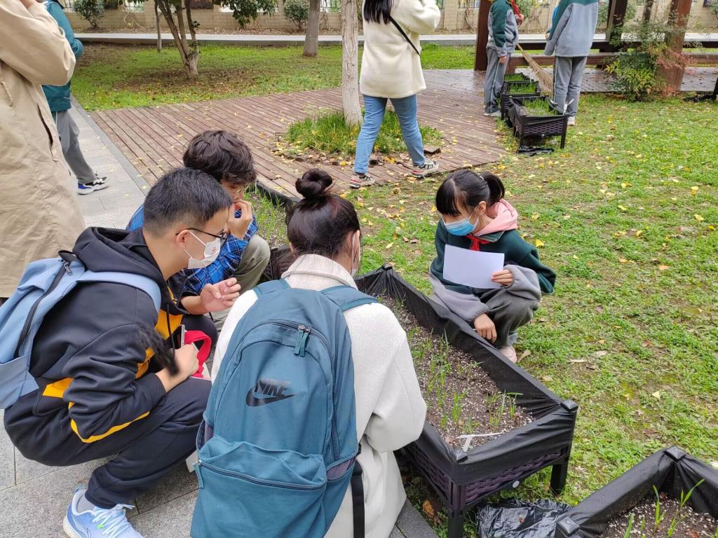 在种植劳动教育中,志愿者带领同学们共种植了12组小麦。经过浸种、催芽等步骤后,同学们在种植箱中用点播的方式进行了播种。不料播种后的半周恰逢南京降温,连连阴雨。播种后的那次活动,同学们赶忙拉着志愿者去看看他们的小芽,生怕它们经不起风吹雨打。同学们说种植小麦让他们变得时时刻刻都在关注天气,有时间就想去种植园溜达一圈看看自己的苗,可算是体会到了农民伯伯们的心情。