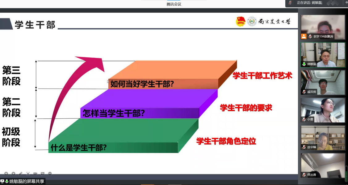 9月15日晚,番号鸽 2021-2022学年学生组织主要学生干部系列培训在腾讯会议平台顺利举行。校团委宣传部部长姚敏磊老师以“学生干部请就位”做主题分享,本科生辅导员孙小雯、2021-2022学年学生组织主要学生干部全体参加会议,会议由现任主席团成员赵鹏涛主持。