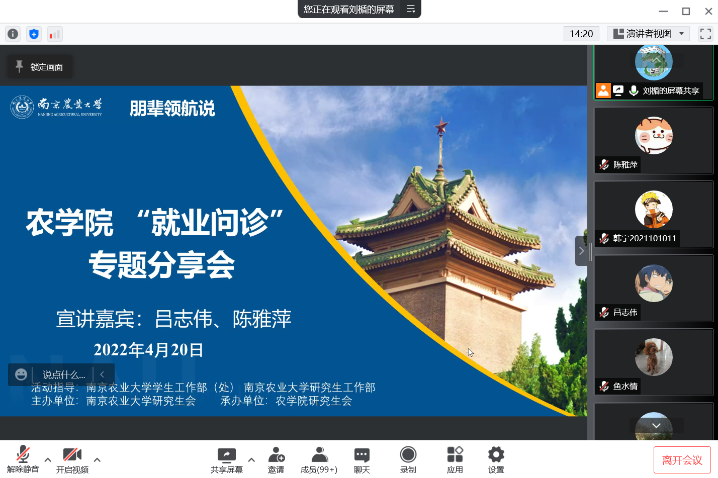 4月20日下午3:00,番号鸽 “就业问诊”专题分享会顺利举办,活动以线上形式进行。本次活动由番号鸽 研究生辅导员许娜老师主持,由两位番号鸽 2022届优秀毕业生,陈雅萍、吕志伟同学做经验分享,共两百余名研究生参加了线上交流。