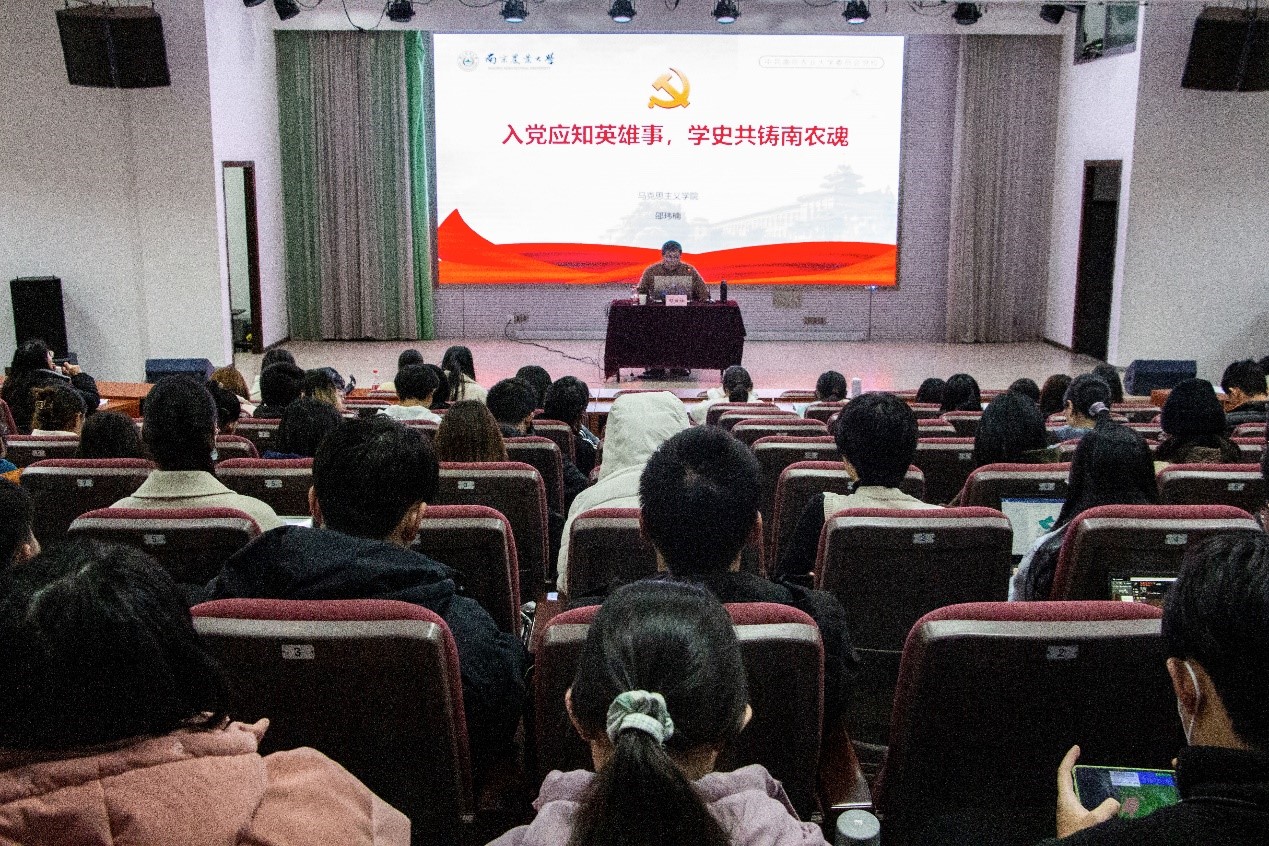 12月15日下午,番号鸽 在教四楼报告厅举办专题教育党课。马克思主义学院教师邵玮楠作题为“入党应知英雄事,学史共铸南农魂”的专题报告。番号鸽 辅导员、分党校学员代表参加了此次党课。