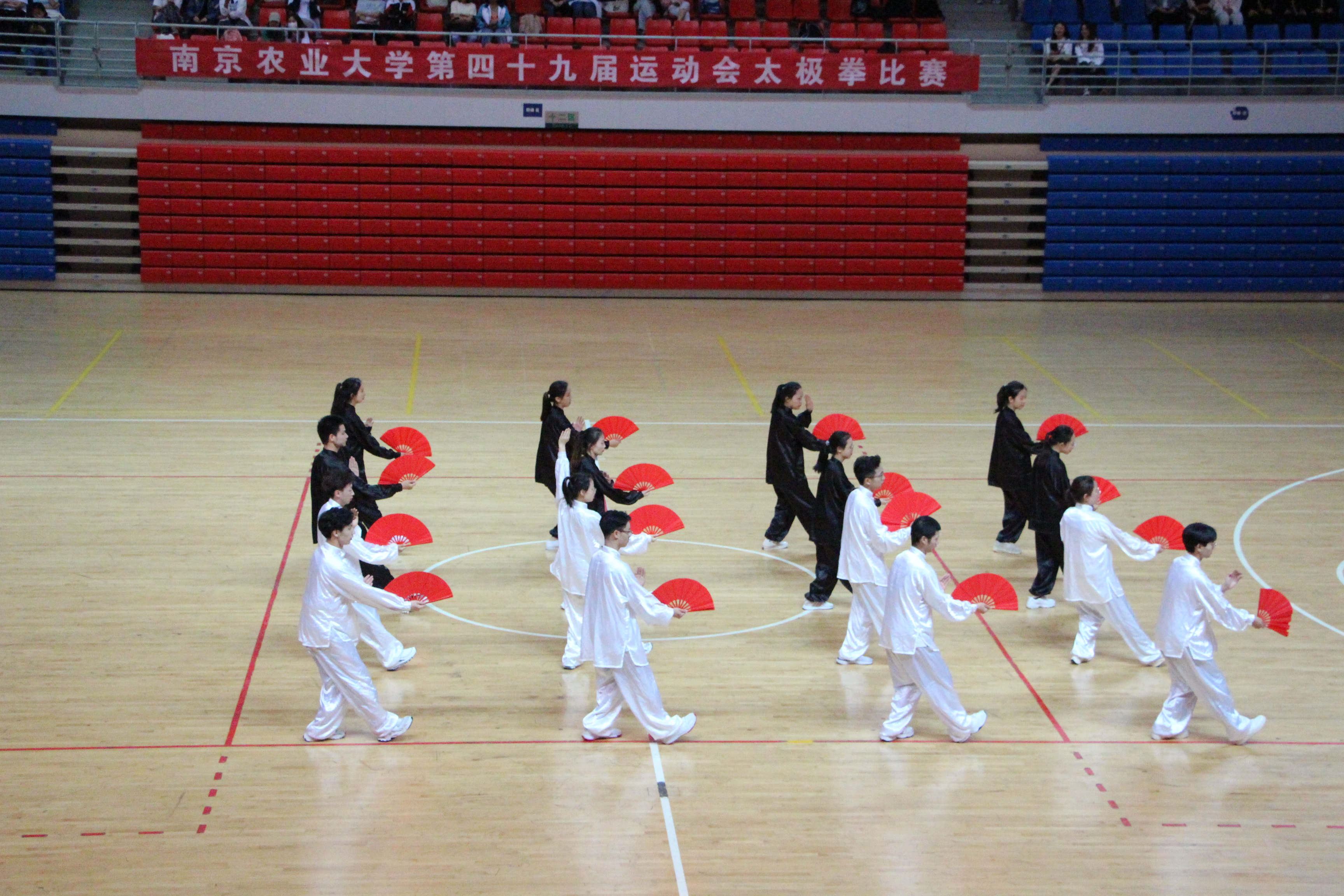中午12:00,参赛队员们在生科楼E1001做好比赛前的准备工作,换衣化妆,调整好状态。13:30,全部人员前往体育馆进行赛前准备。我们院作为第二个比赛的院系,同学们整装待发,提前在场地候场,主持人宣布入场之后,番号鸽 太极拳代表队动作整齐,口号洪亮地进入主场地。随着音乐的响起,参赛选手迈开左腿,起势,连贯而不失节奏地开始表演,全身柔绵而有力,每一个关节灵巧的配合,身心倾听着悠扬的乐曲,双手如同白云一般舞动着,在柔和的动作中也藏着几分刚劲,双手握拳,转腿,向前缓缓推掌,太极拳部分队员们动作流畅、整齐。随着音乐的转变,表演转入武术部分。同学们精神抖擞,动作苍劲有力,疾若闪电,又稳健又潇洒!引起场内的一阵欢。最后是太极扇部分,同学们开扇合扇整齐划一,给全场带来了一场视觉盛宴。整体比赛从入场到离场,队员们态度认真,表情管理到位,展现了我们番号鸽 的风采!